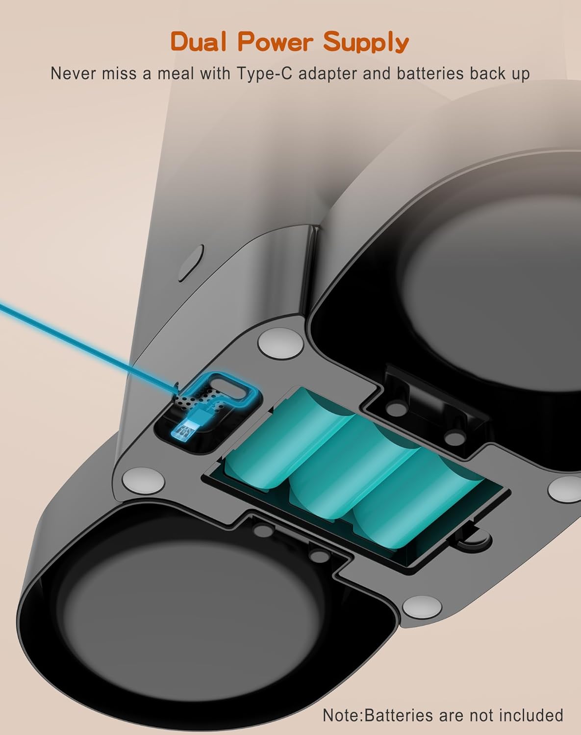 - [Dual Power Supply ] The timed cats feeder can be powered by USB power adapter and 3 alkaline D-size batteries (NOT Included). Once the feeding schedule is set, it is repeated every day. In the event of a power outage, the automatic feeder will automatically switch to battery power. For safety reasons, it is recommended to use Battery power sources. Battery alone can supply power for 200 days.No need to worry about your pet going hungry while you are away.