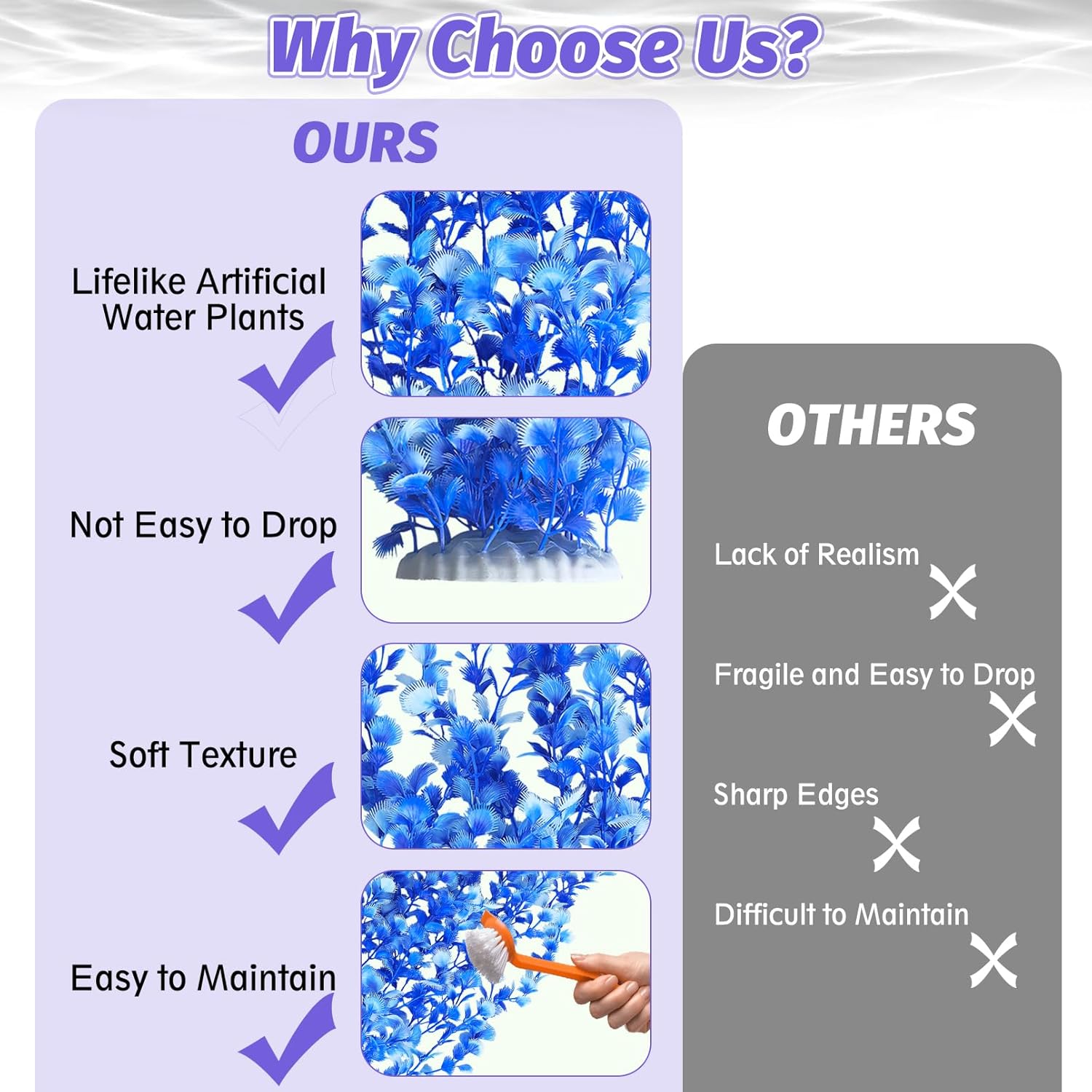 - SAFE AQUARIUM DECORATIONS: Our artificial aquatic plants are crafted from flexible, aquarium-safe plastic that maintains water quality. Featuring smooth edges and a natural texture, these decorations protect delicate fish fins while creating a vibrant underwater habitat. Designed for long-lasting color retention, the realistic foliage remains fade-resistant in both freshwater and marine environments.
