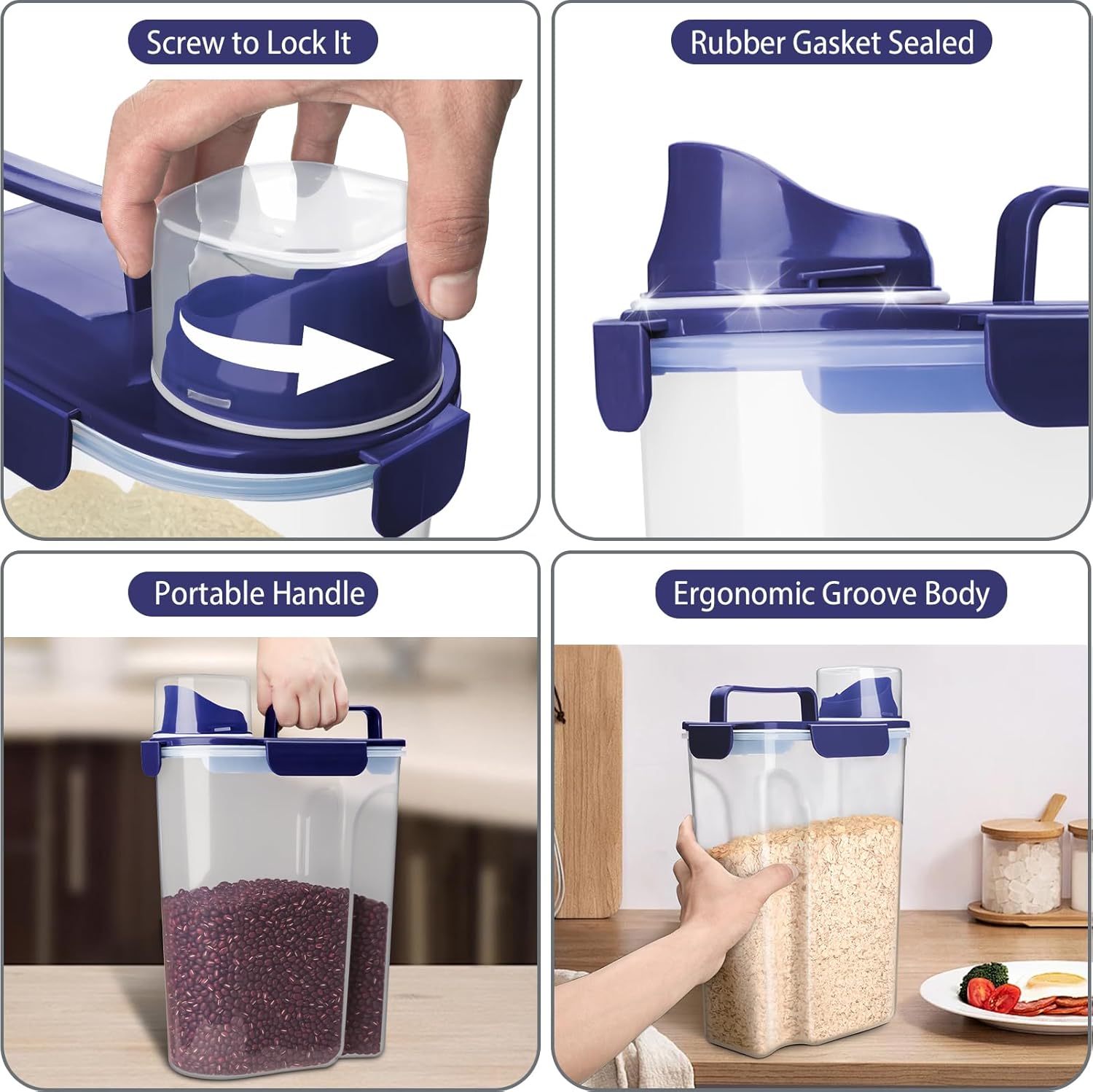 - 💖【Multifunctional Dry Food Storage Containers】This rice container can hold about 10 lbs rice, 7lb flour, 5lb dog food. (The capacity will vary depending on the density of the stored material). Perfect for storing Cereal, Beans, Sugar, Pasta, Nuts, Snacks, Pet Food, Candy, Laundry Beads, and more.