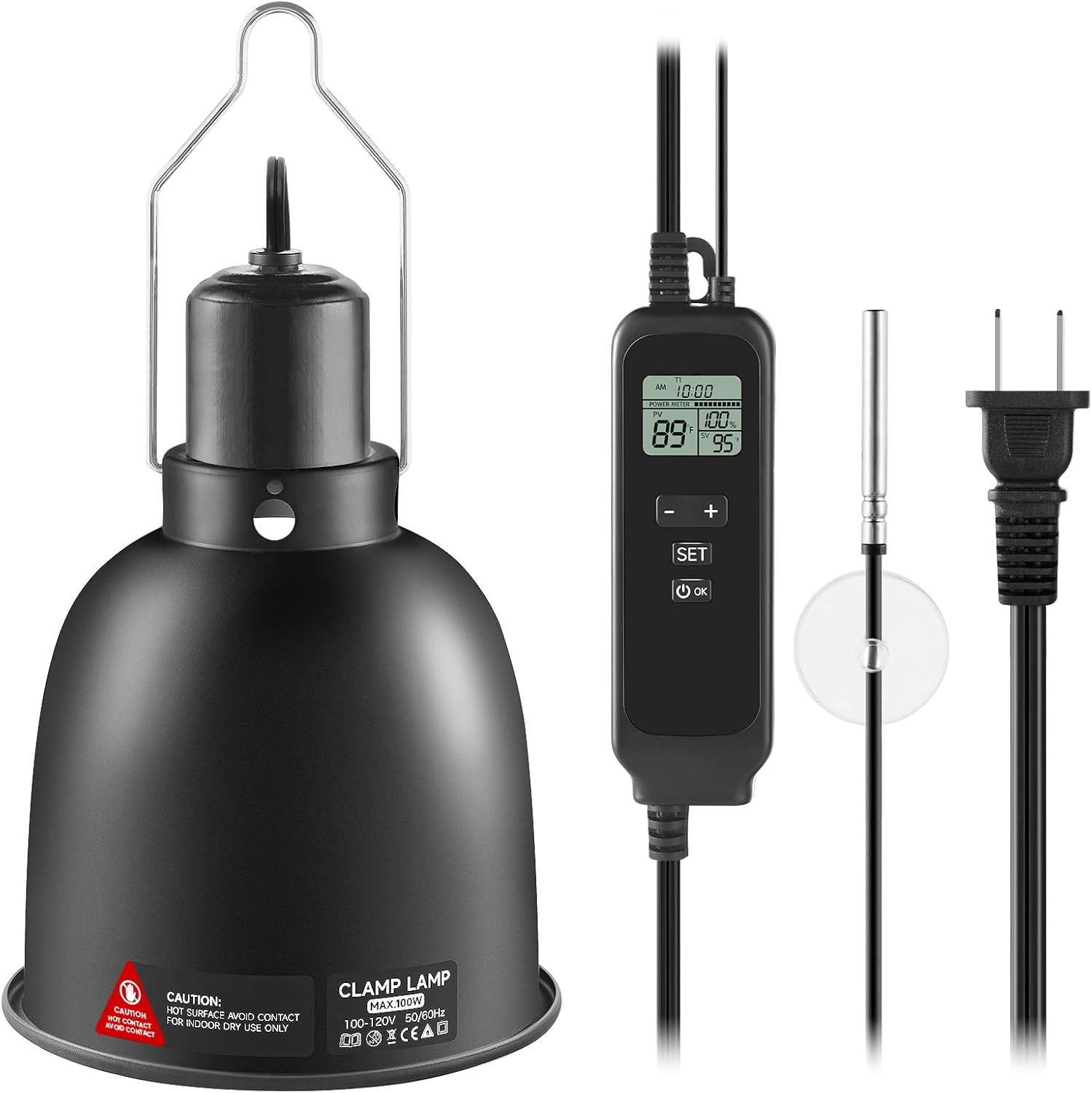 5.5 inch Reptile Heat Lamp Fixture with Thermostat and Timer,Reptile Light Fixture with Dimming Thermostat Max 100W,PID Temperature Controller for UVB Lights,Basking Heat bulbs and Terrariums