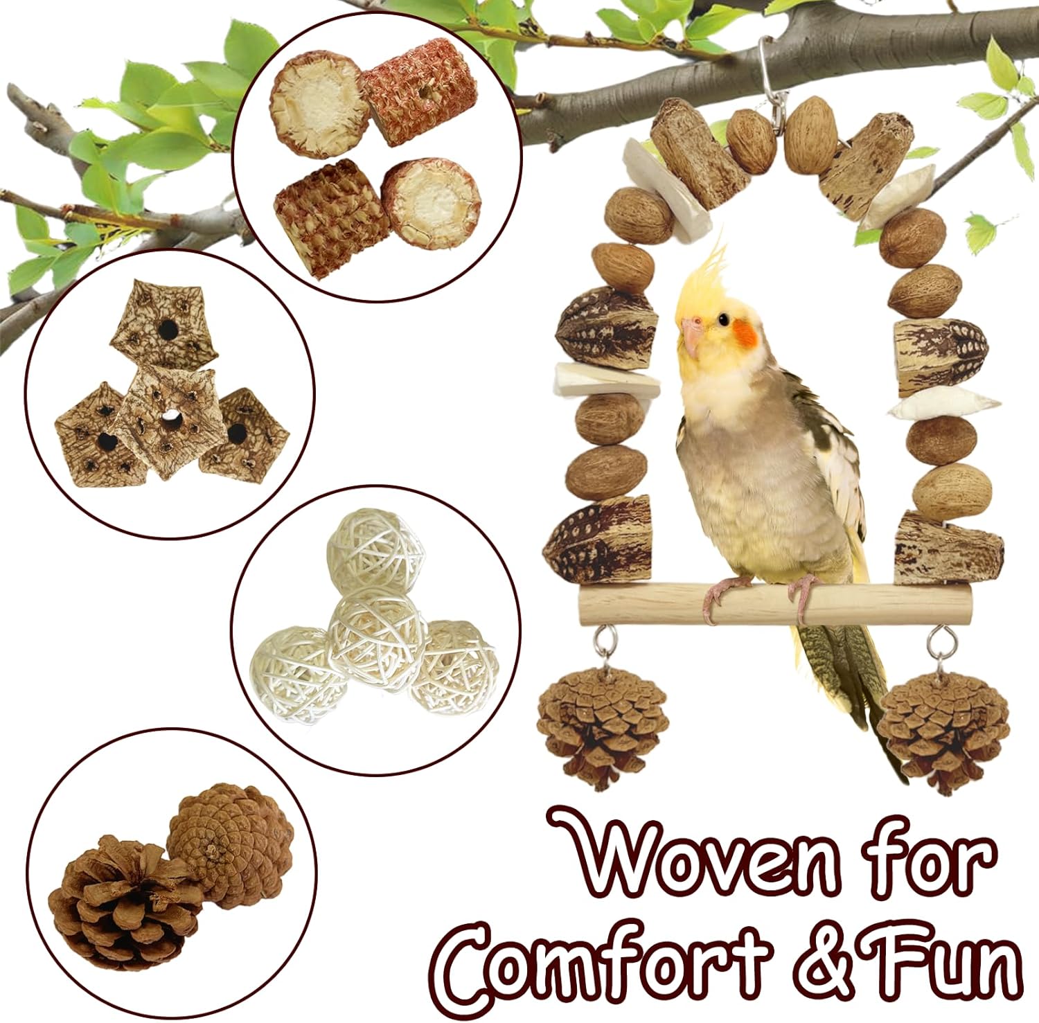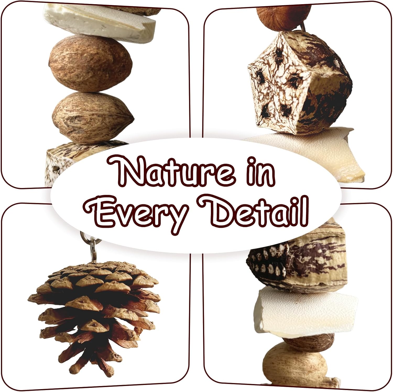 - Safe, Non-Toxic Materials for Peace of Mind: Made from natural wood, pine cones, and other untreated materials, the HOSUKU Nut Perch Stand is safe for your bird to chew and play with. No plastics, no dyes—just natural bird toys that provide safe, fun enrichment.