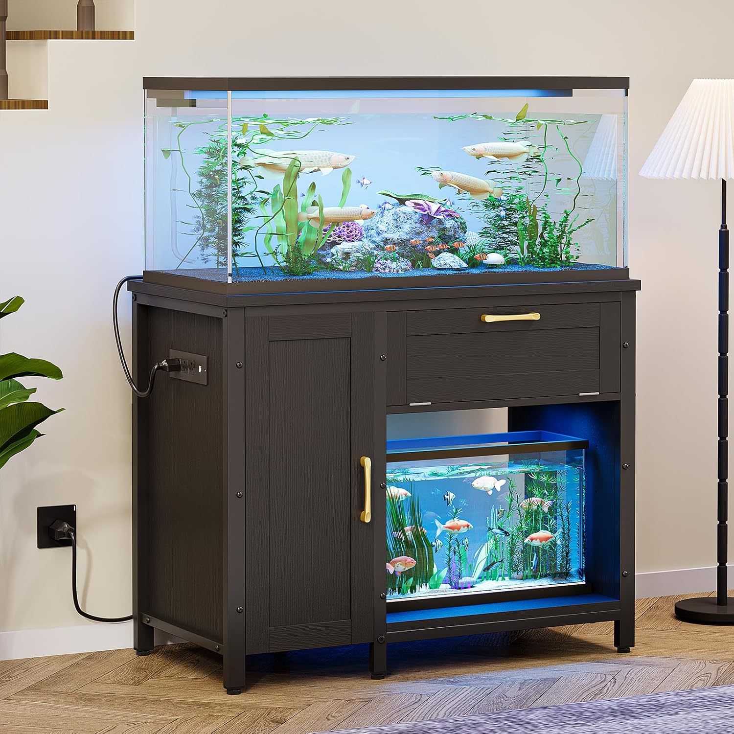 - Sleek Modern Style: Featuring a chic black oak finish, the 40 gallon aquarium stand is designed with a cabinet and drawer accented by gold door handles, adding a touch of modern elegance to your living room decor