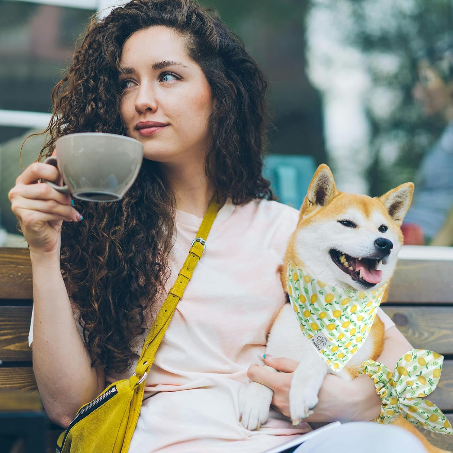 E-Clover Summer Lemon Dog Bandanas & Matching Scrunchie Set Green Stripe Dog Scarf Bibs Pet Bandana with Bow Tie for Small Dogs Puppy Owner Mom