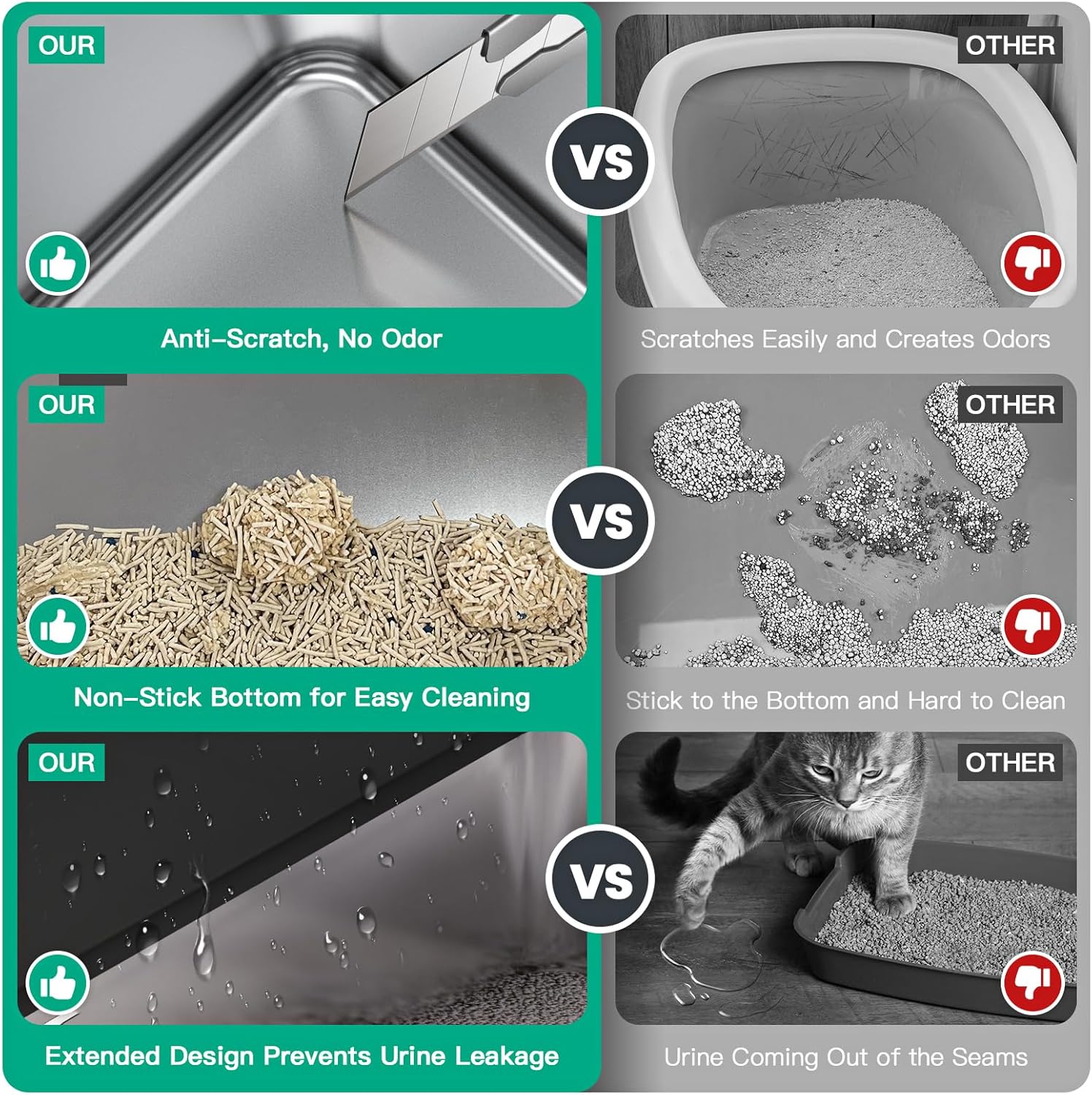 - 【NO ODOR Metal Cat Litter Box】The jumbo metal litter box stainless steel is not easy to be scratched and will not absorb odours, so no matter how long you use the stainless steel litter box extra large there will be no unpleasant odour