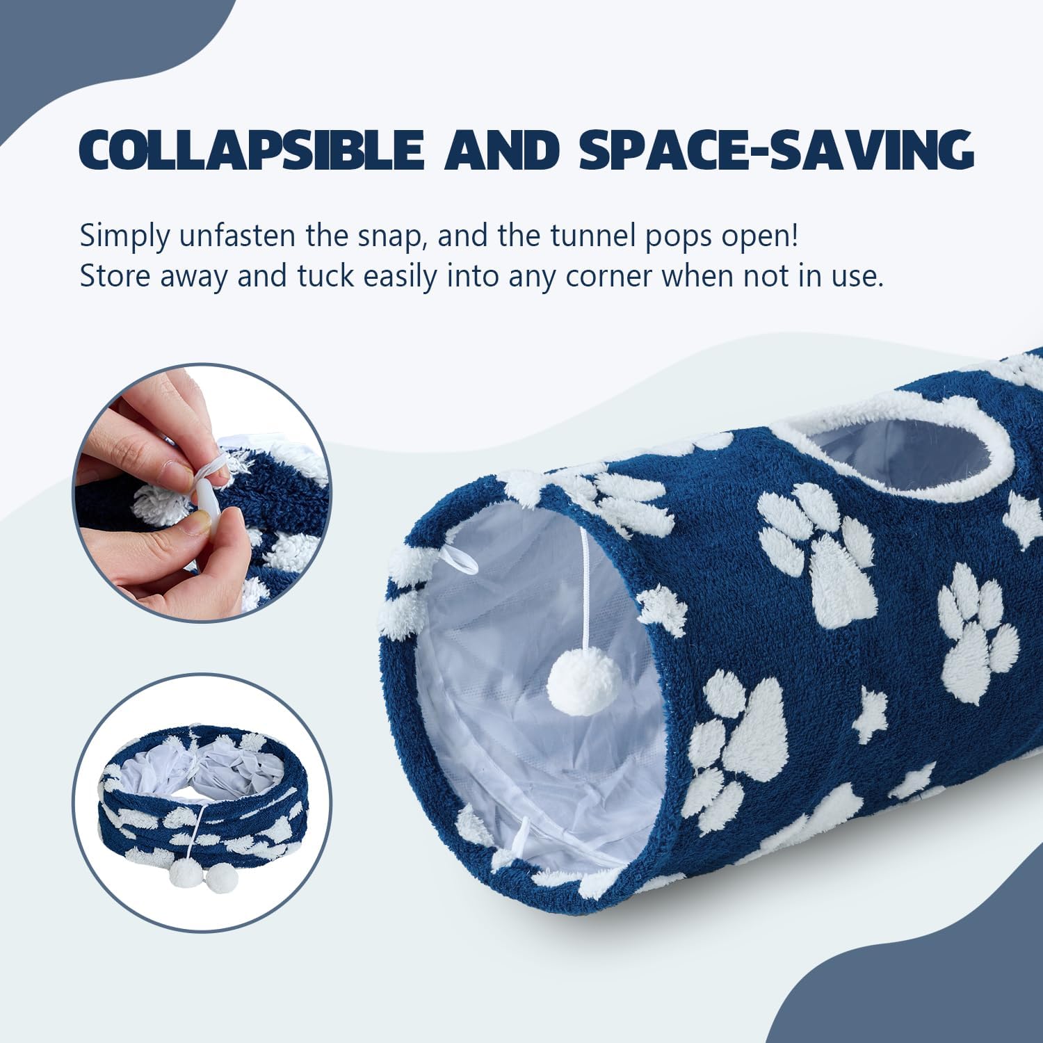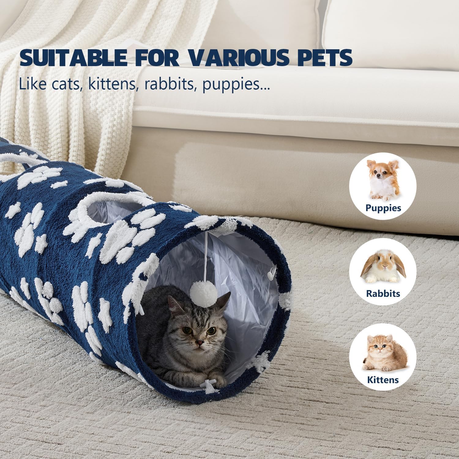 Straight Cat Tunnel for Indoor Cats 47"x12", Cute Cat Toys Collapsible Tunnel Tube with Balls for Puppy Kitten Rabbit, Blue Paw