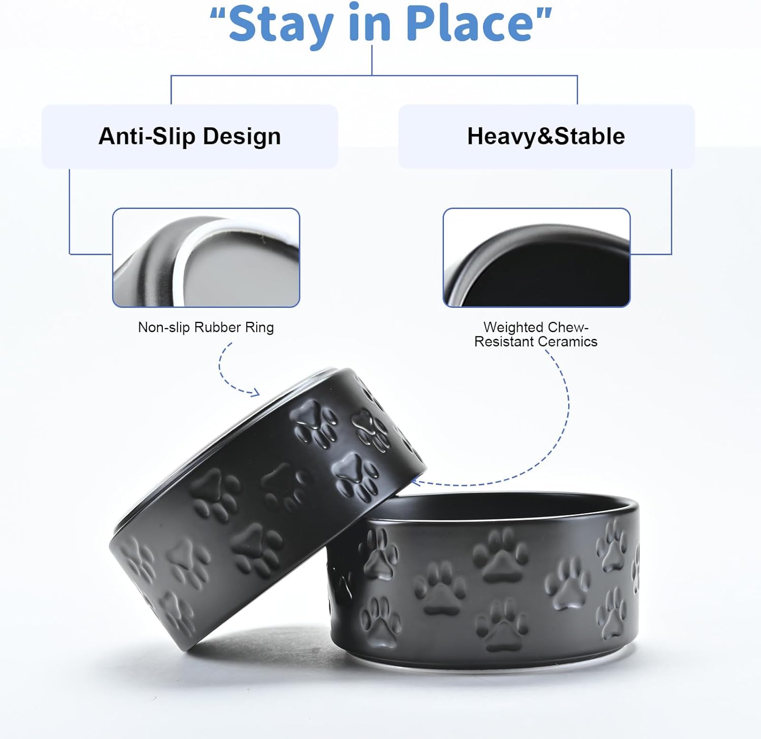 SPUNKYJUNKY Ceramic Dog Bowls 2 Pack, 8.3'' Dog Food Water Double Feeding Bowls Non-Slip for Medium to Large Sized Breed Microwave Dishwasher Safe - 60 OZ, 2pcs, Paw Black
