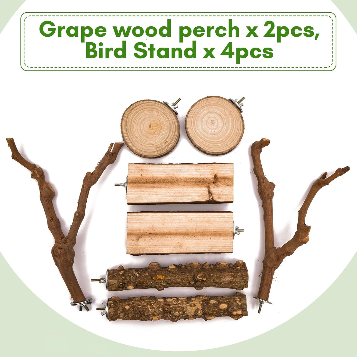 8pcs Brid Perch Bird Cage Accessories 2 Natural Grape Stick Paw Grinding Fork 6 Parrot Stand Bird Toys for Parakeets, Cockatiels, Conure, Budgies