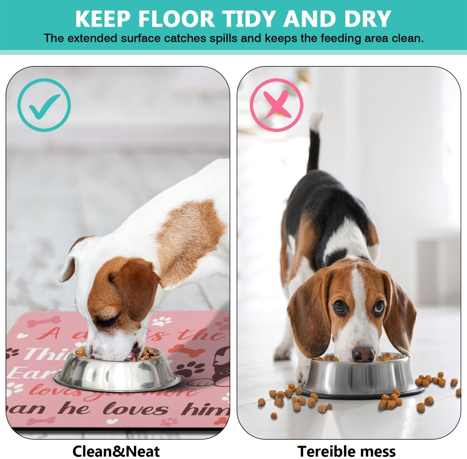 • Waterproof & Easy Clean Dog Food Mats for Floors Waterproof - Unlike regular mats, our heavy-duty dog food mat features a 100% waterproof layer that prevents liquids from seeping through the floor. Simply wipe clean your dog bowl mat after meals - no staining or odors! Works great as both a dog food mat and cat food mat.