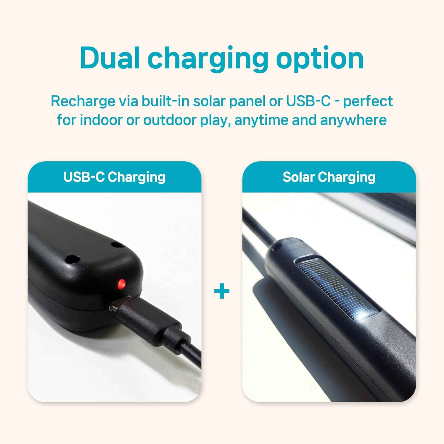 - 【Dual charging option】 Recharge via built-in solar panel or USB-C - perfect for indoor or outdoor play, anytime and anywhere.