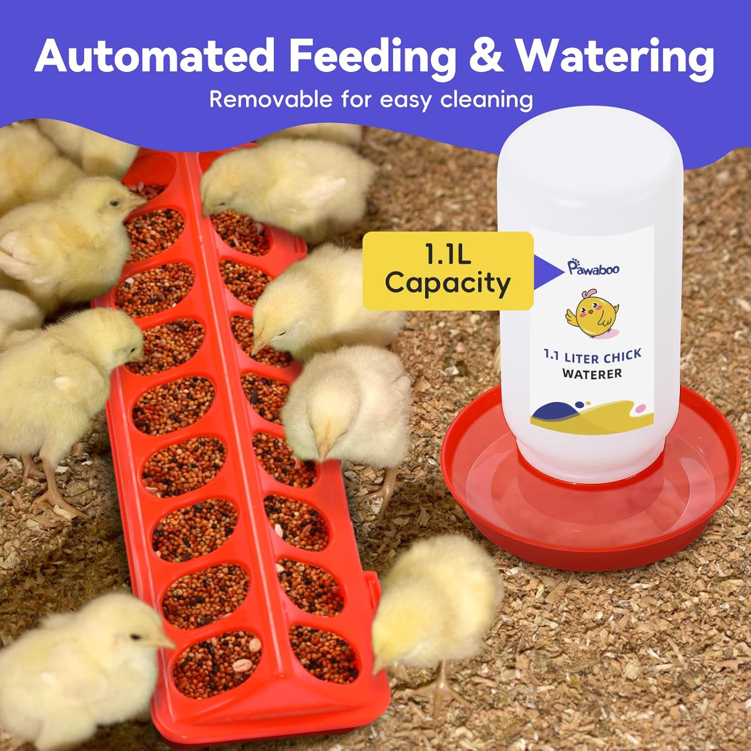 - 【5-In-1 Chick Feeder Starter Kit】 Chicken feeding combination set, suitable for starter to feed baby chick at home. Package content: 1*small pet playpen, 1*chicks perch, 2*18 holes feeder, 1*water feeder, 1*chick feeding instruction manual.