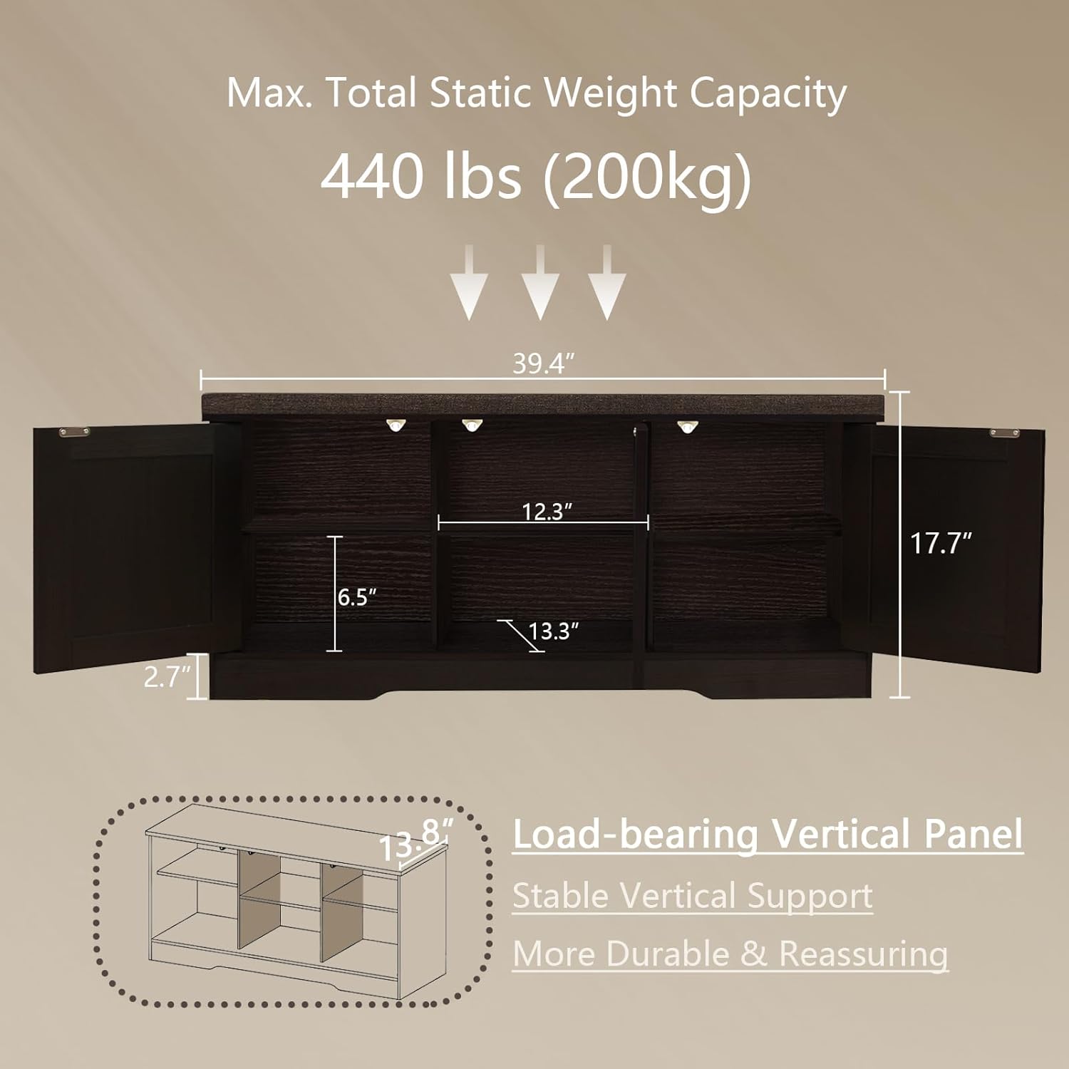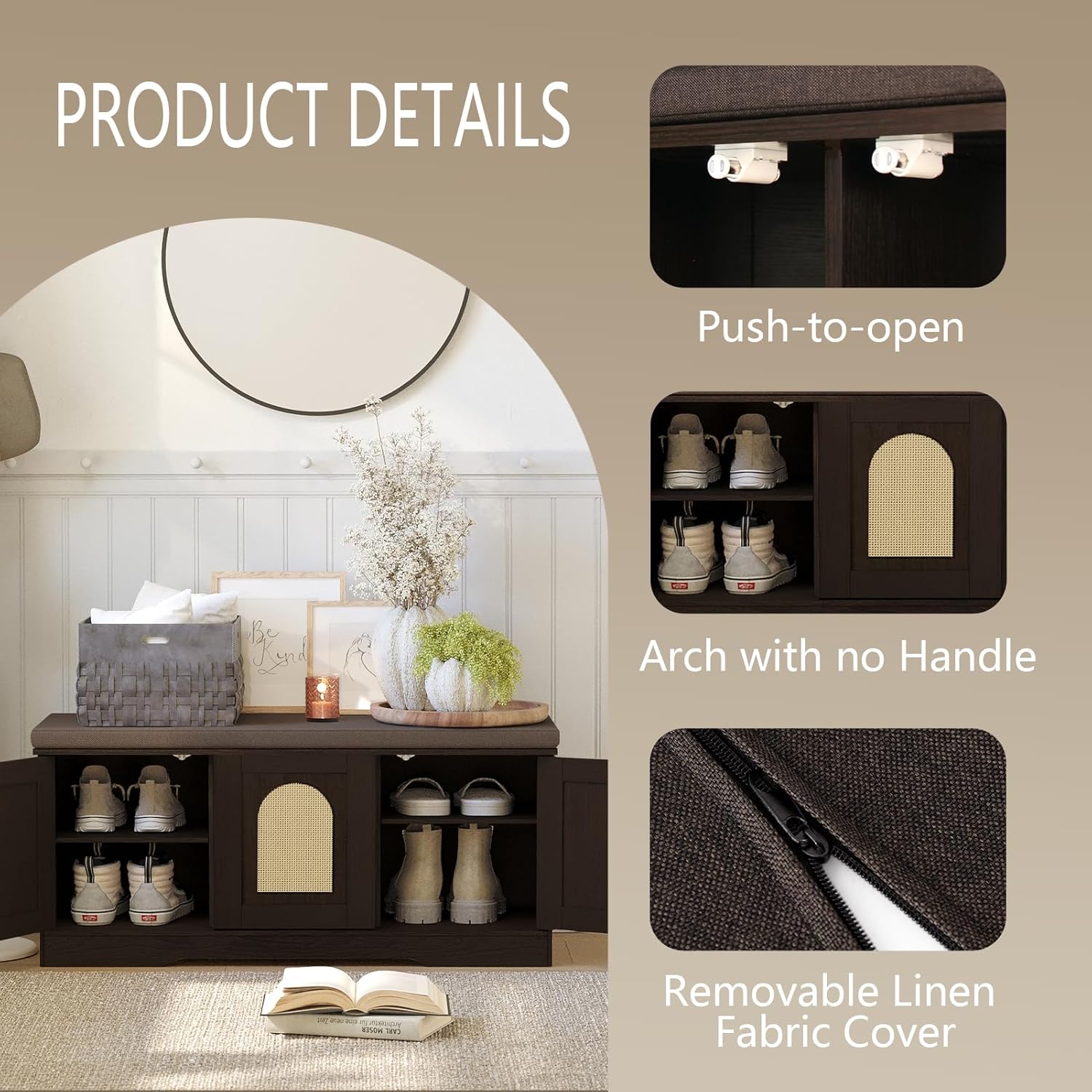 DINZI LVJ Shoe Bench, Entryway Storage Bench with Doors, Cushion, 2-Tier Shoe Rack with 6-Cubby, 39.4”L x 13.8”W Shoe Organizer Cabinet, Adjustable Shelf, Living Room, Bedroom, Espresso with Rattan