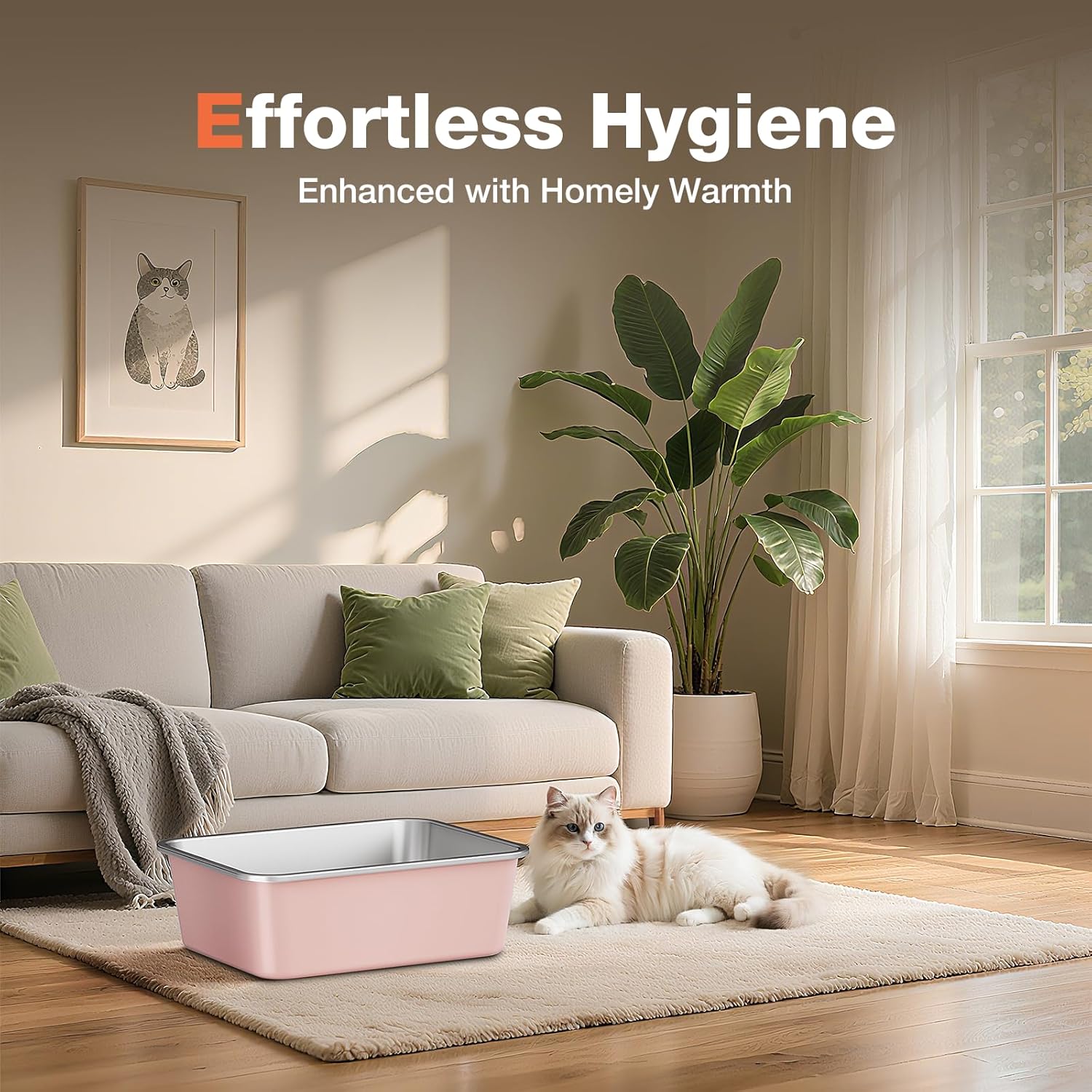 Stainless Steel Litter Box, Large Metal Cat Litter Box for Big and Small Cats, Non-Stick, Easy to Clean, Odor-Free, 19.5" L×13.6" W×3.9" H, Blush Pink