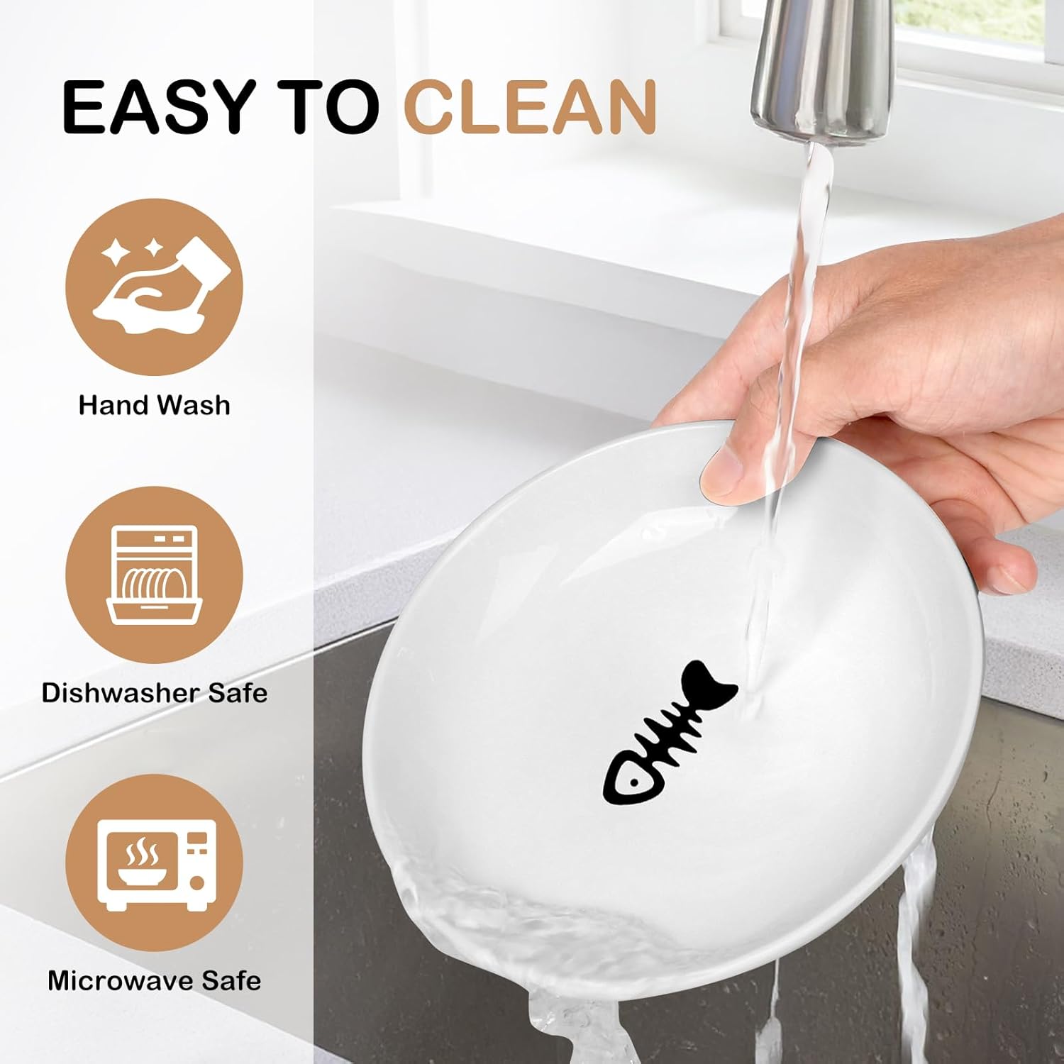 - Cute Fishbone Design: Adorable cat food bowls feature a fishbone print, sparking joy at mealtime for indoor cats. Made of premium ceramic bowls with food-grade glaze that meets human tableware standards. Vibrant colors withstand 800+ dishwasher cycles without fading. This 4-pack offers dedicated bowls for wet/dry food, water, and treats – perfect for multi-cat homes while preventing flavor transfer.