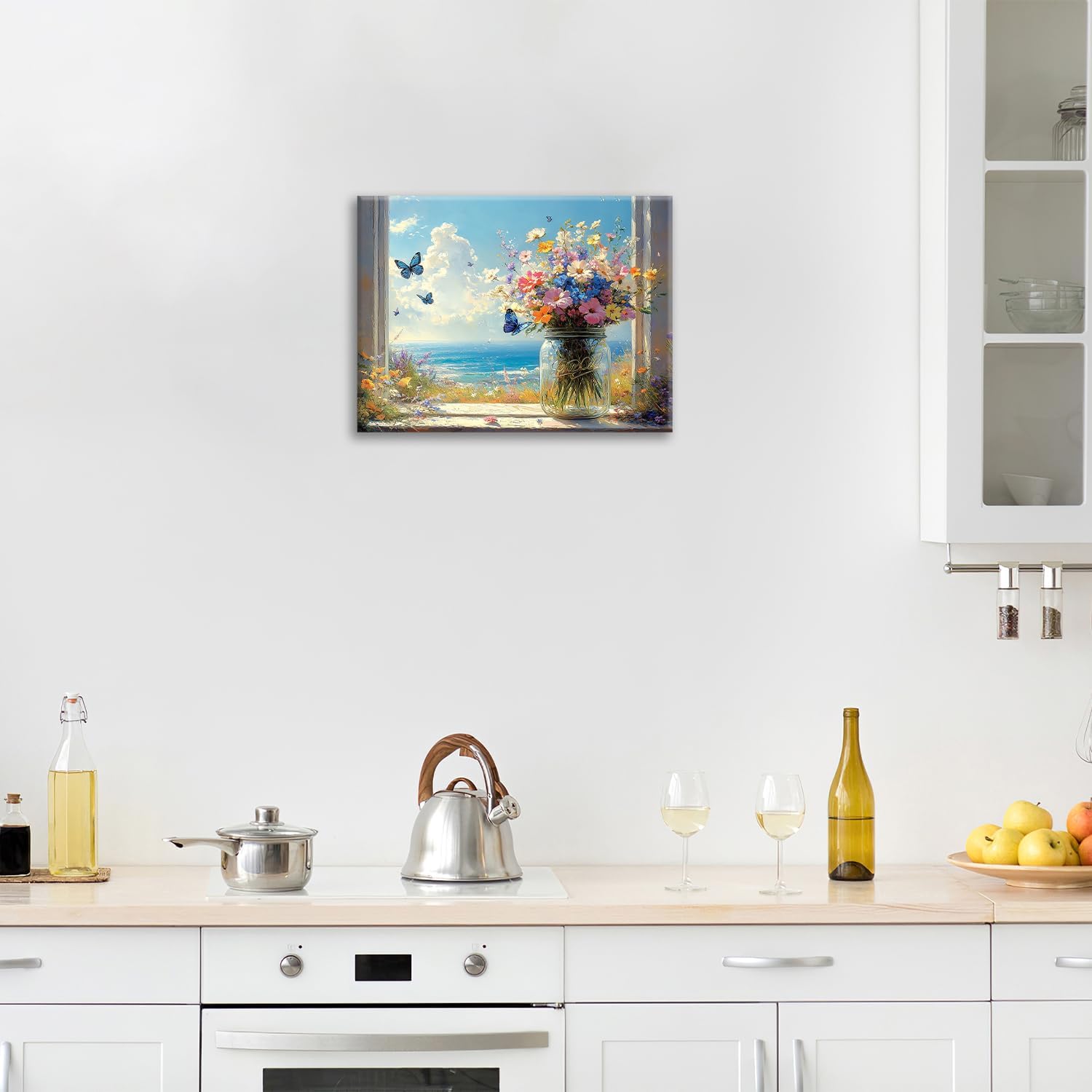 Beach Floral Bathroom Pictures Wall Art, Colorful Flower Bathroom Wall Decor, Coastal Ocean Framed Painting Canvas Artwork for Bedroom Living Room Decorations 16"L x 12"W