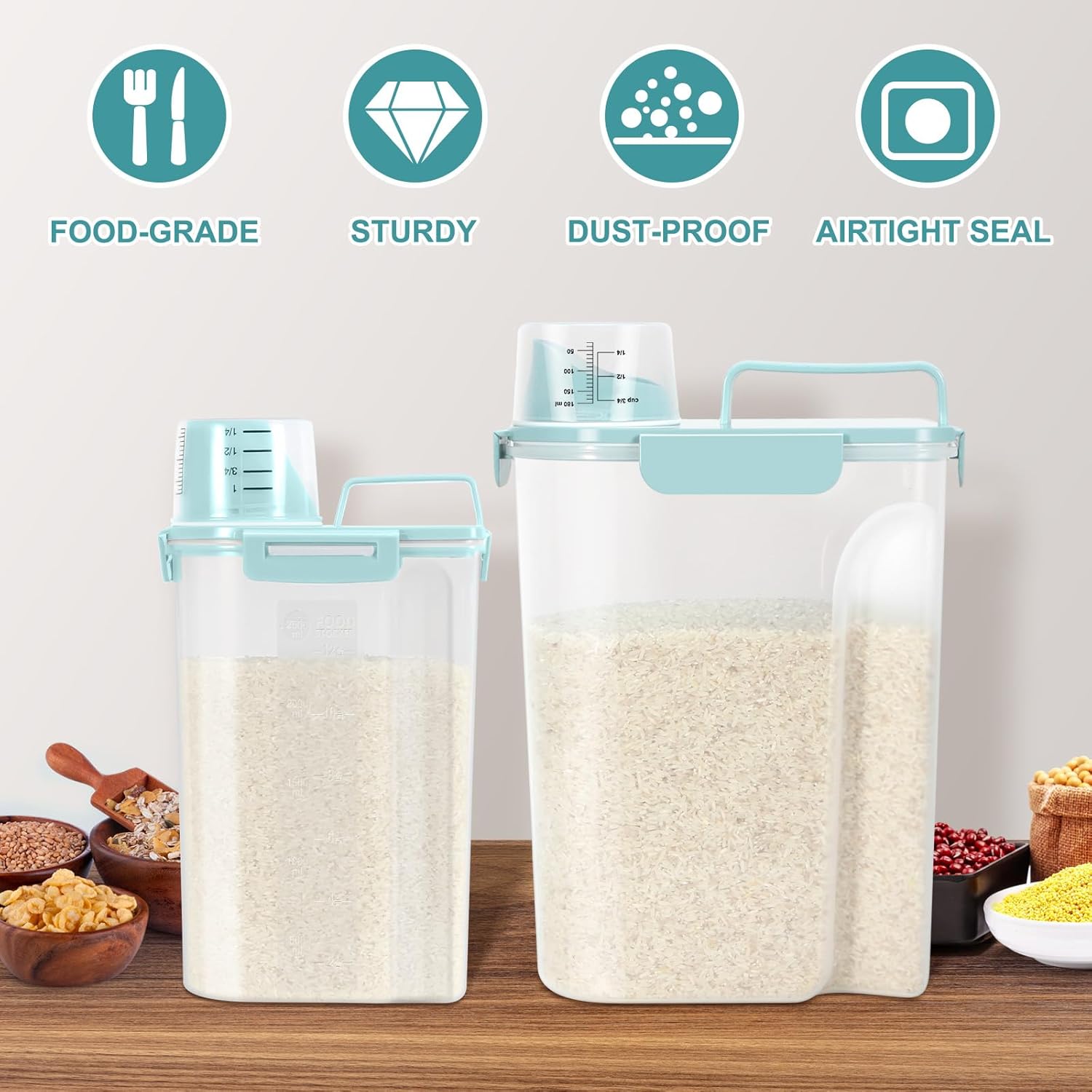 TBMax Rice Container 2 Pack, Airtight Cereal Container Oatmeal Storage with Easy-pouring Spout & Handy Cup for Flour Grain Beans, Pet Dog Cat Bird Food Storage Dispenser-Sky Blue