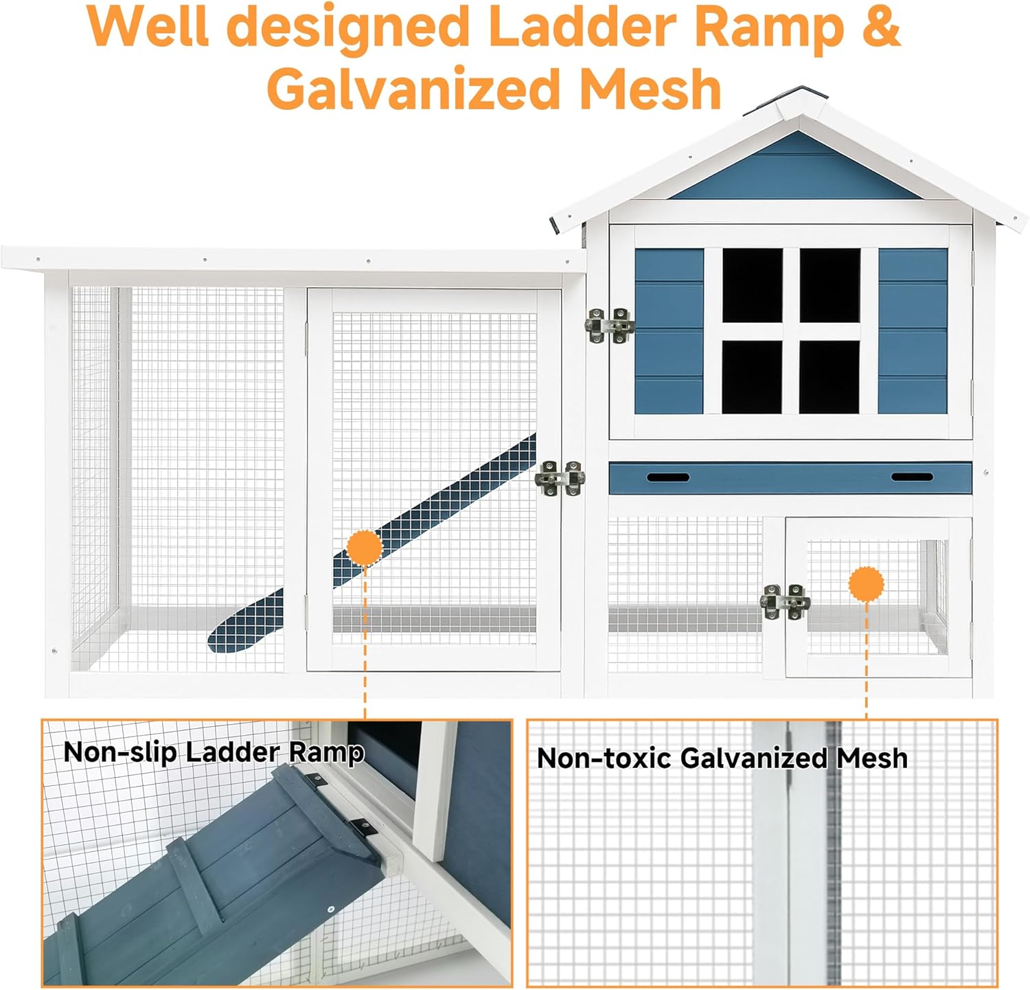 - Dual-Living Indoor/Outdoor Haven, Perfect as a chic indoor bunny condo or a backyard chicken coop! The widened anti-slip ramp, 2-story design, and 4 access doors (front/side/roof/ramp) let pets climb, play, and rest, while you bond through multiple interaction points. Fits apartments and gardens alike