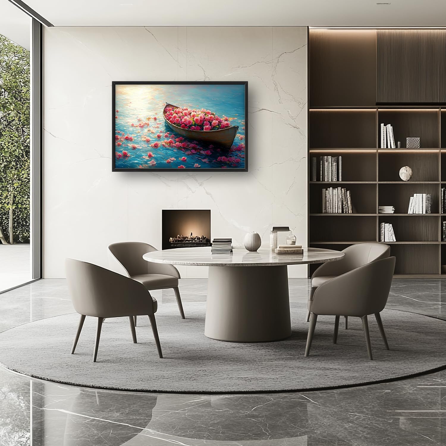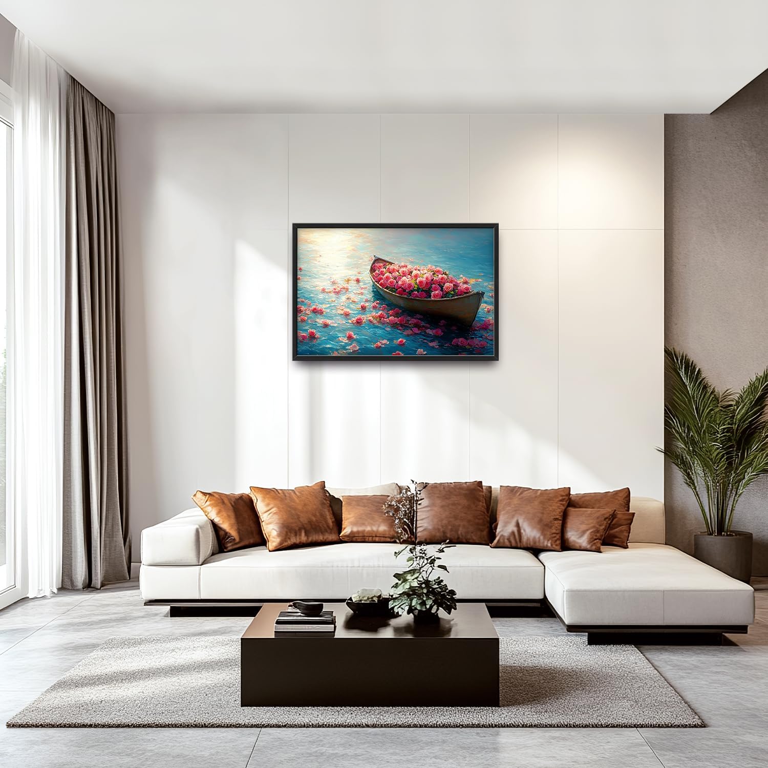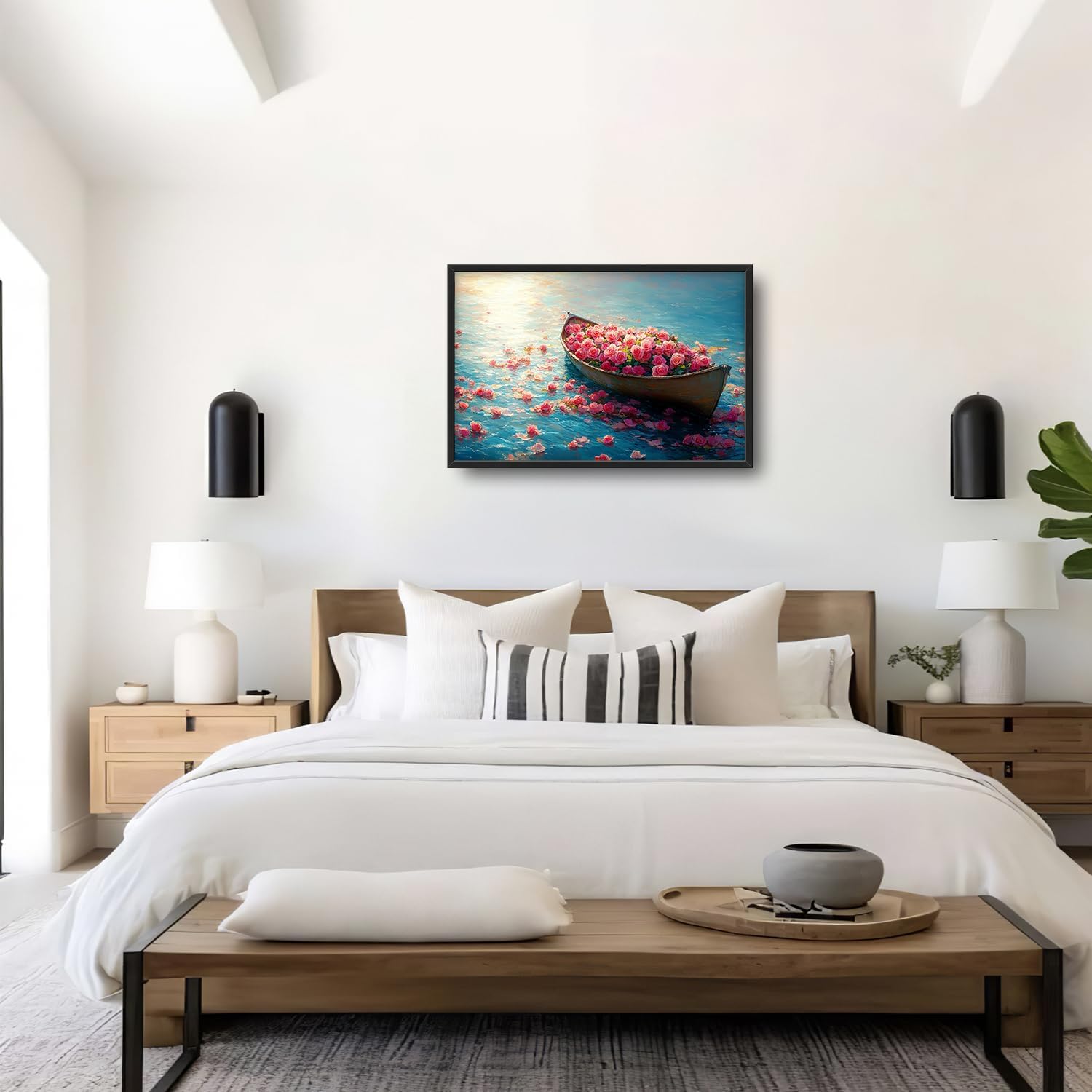 Large Lake Floral Landscape Wall Art for Living Room, Nature Boat Flower Canvas Oversized Wall Decor, Rose Scenery Framed Pictures Painting Print Artwork for Bedroom Office 36L" x 24W"