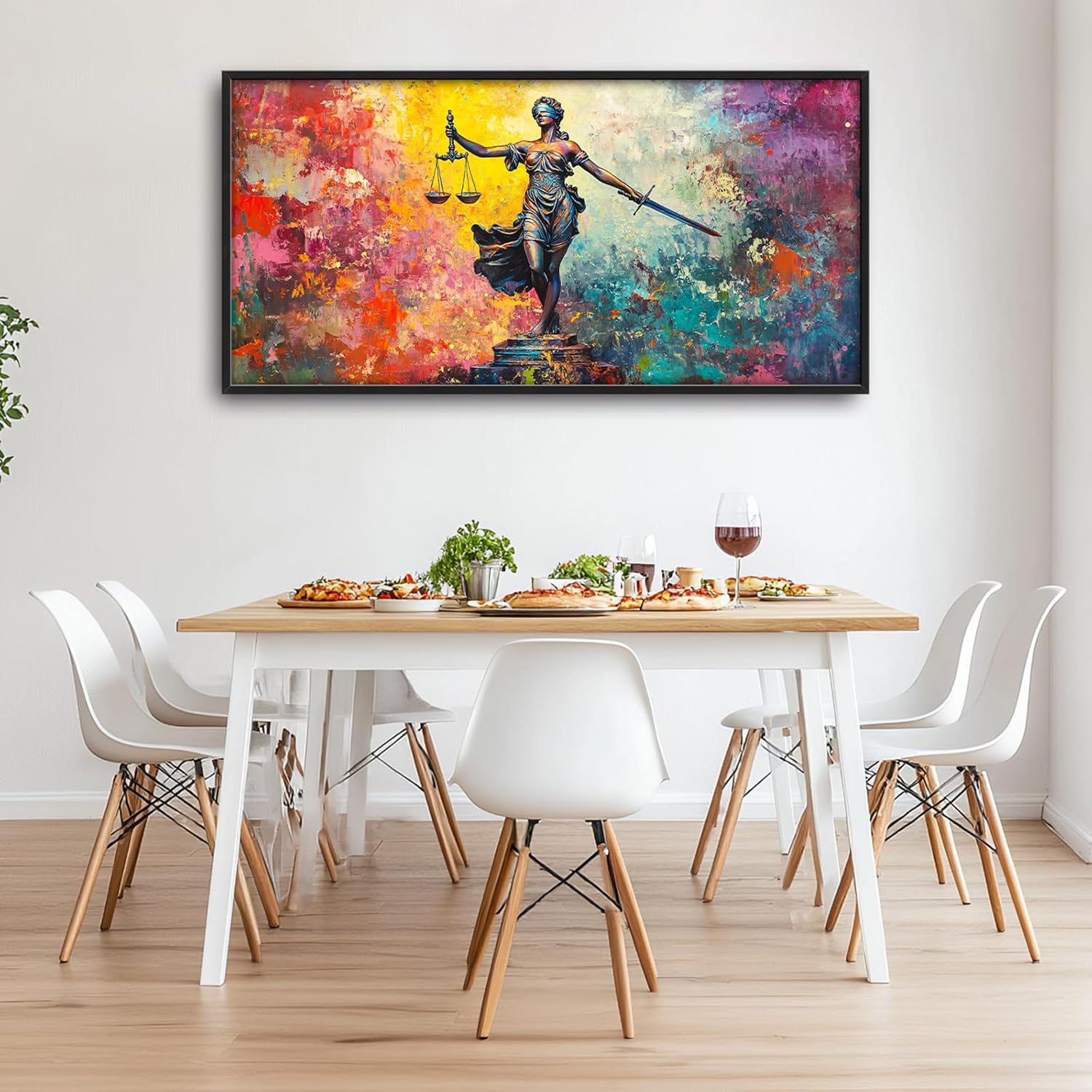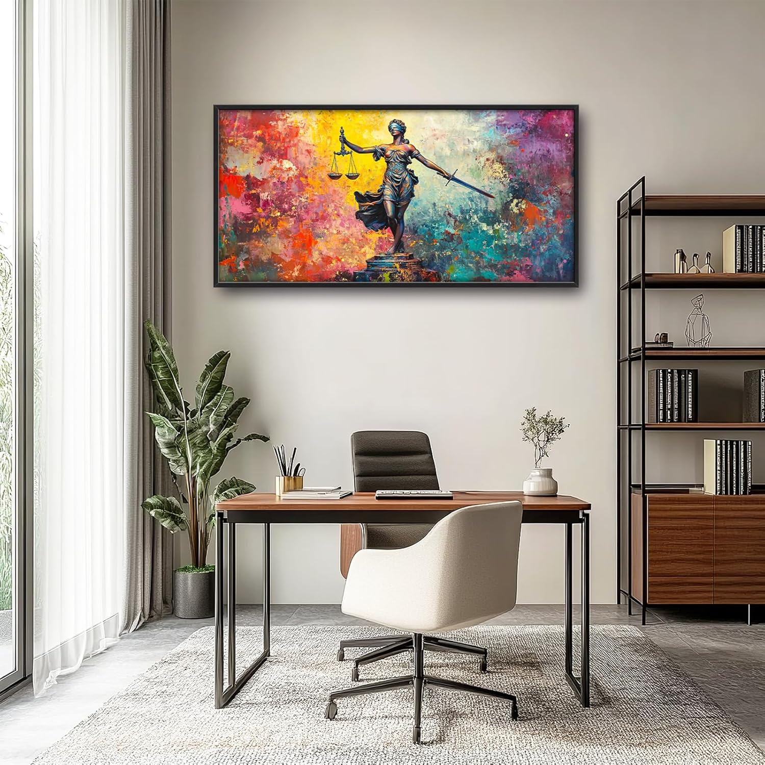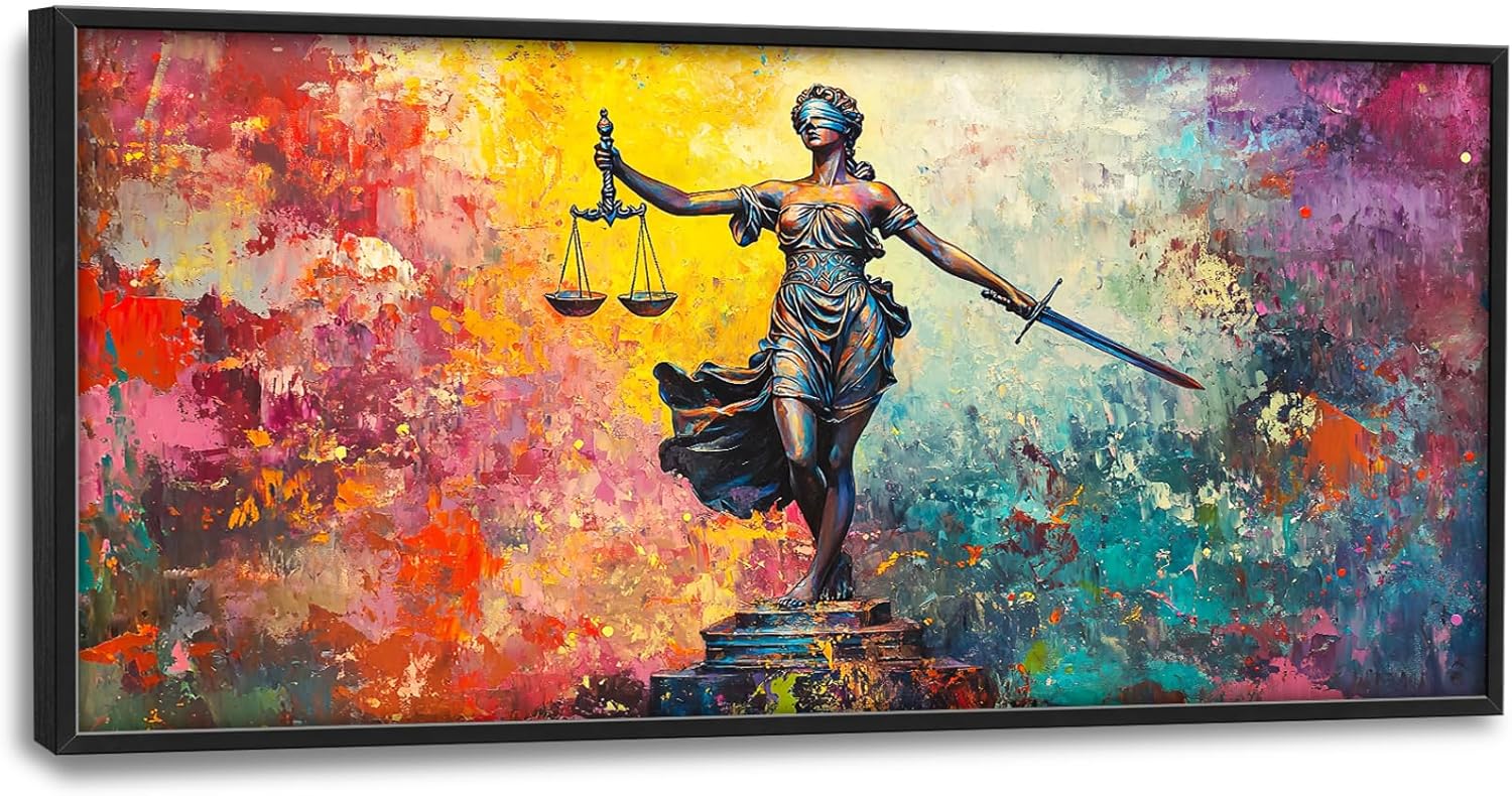 - 【Unique Design】 The painting depicts the Statue of Lady Justice holding a sword and scales in front, with bright, vibrant colors in an oil-on-canvas composition and a colorful background.
