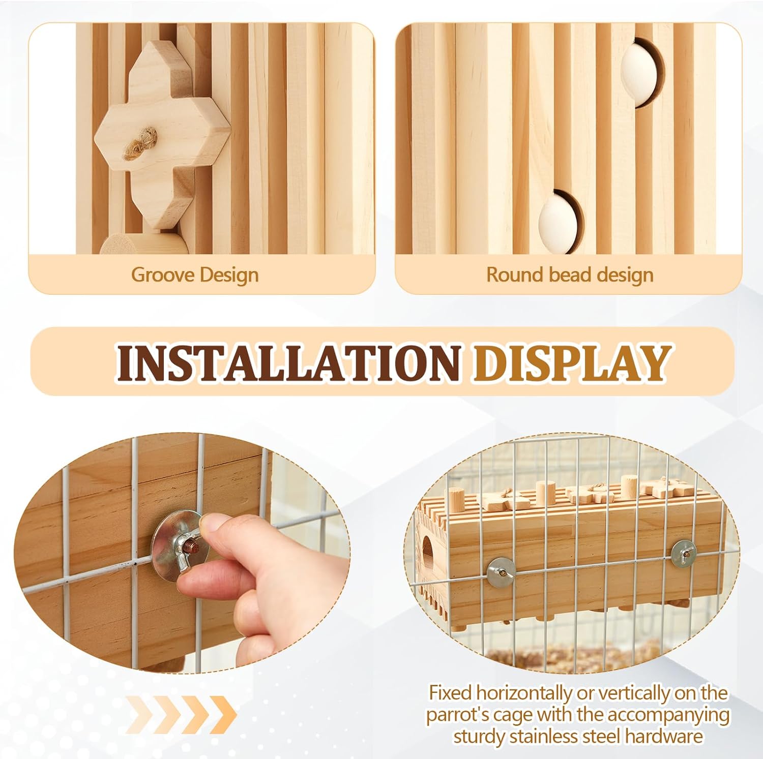 - Wood's Natural Character: due to natural differences in wood, color and appearance may vary; This toy includes a variety of wires, holes, beads and other accessories, which can be fixed to the cage bars using the included stainless steel accessories; It provides rich chewing fun and various activities for large parrots