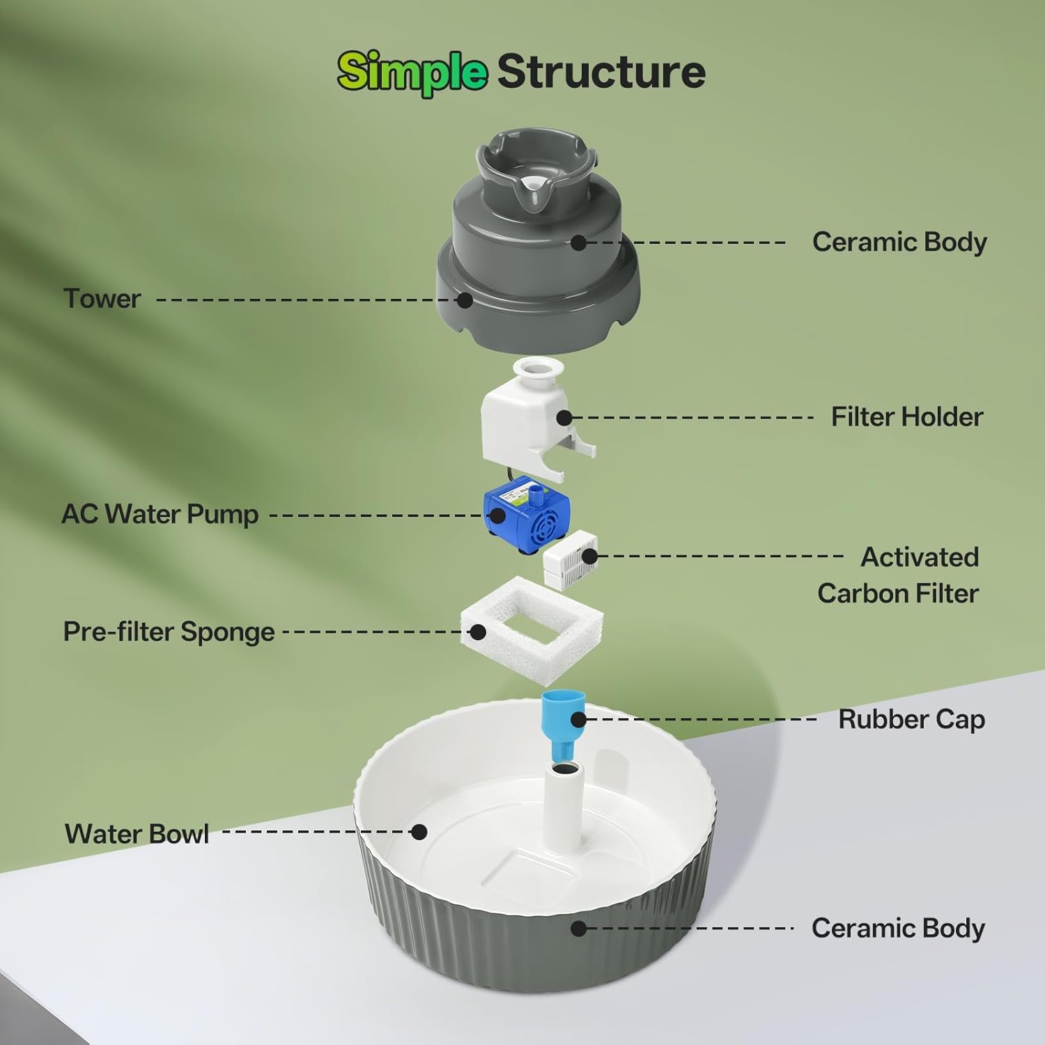 - đ˝ăMulti-Filtration, Water Purificationă: Equipped with activated carbon filter and pre-sponge filter, which can remove sediment, debris and pet hair, this ceramic pet water dispenser can provide a constant supply of flowing purified water. Note: It is healthier to change the filter every 4 weeks!