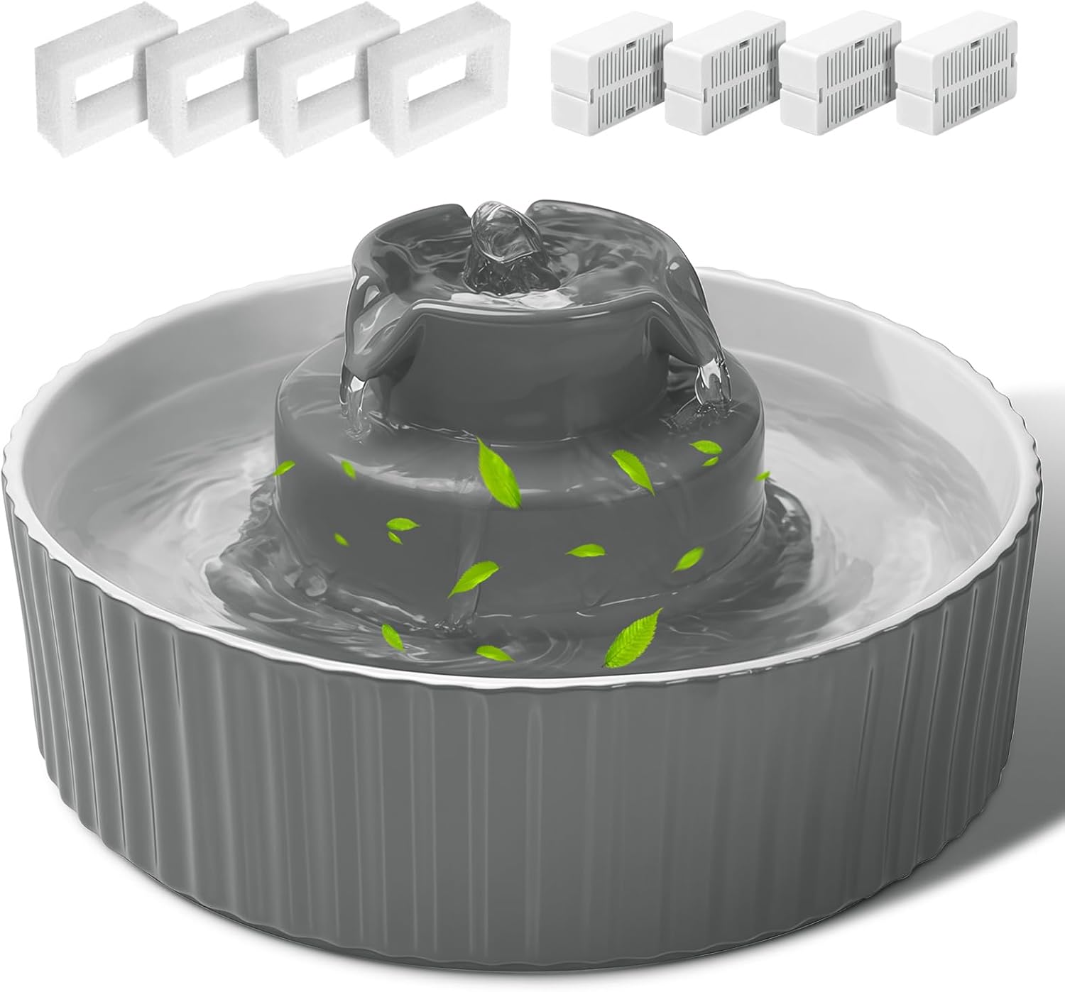 Ceramic Cat Water Fountain, 2.1L/70oz Porcelain Pet Drinking Dispenser with 4 Set Replacement Filter & Sponge, Automatic Dog Water Bowl with Ultra-Quiet Pump, Cat Feeding Watering Supplies(Grey)