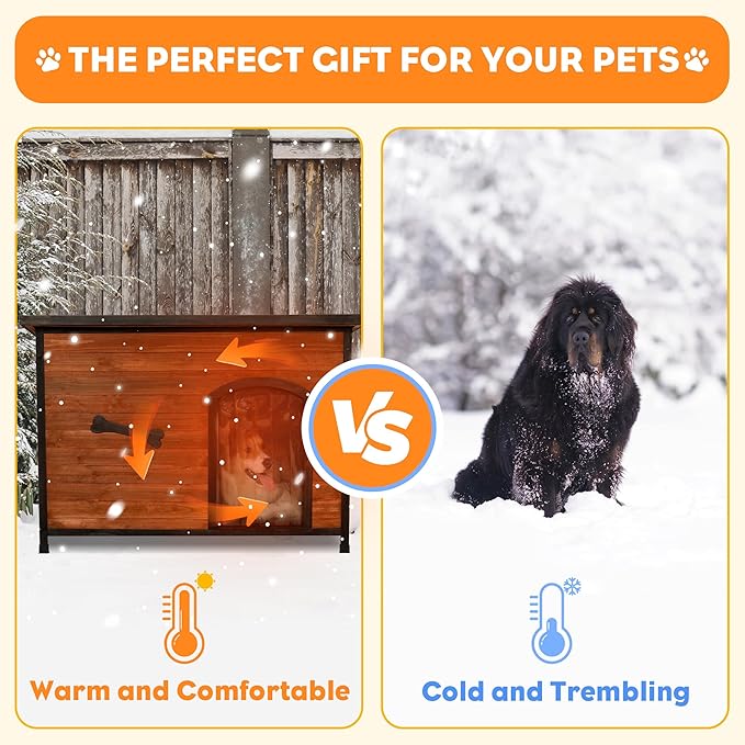 - [Specially Designed for Outdoor Use] The sloping asphalt roof is expertly engineered to prevent rainwater from pooling, ensuring that your pet's living space remains dry and comfortable. The floor is 2.4’’ above the ground, and there is a removable PVC curtain and adaptable floor pads for uneven ground. This design enables the dog house to withstand harsh weather conditions, preventing water from seeping in and materials from getting damp