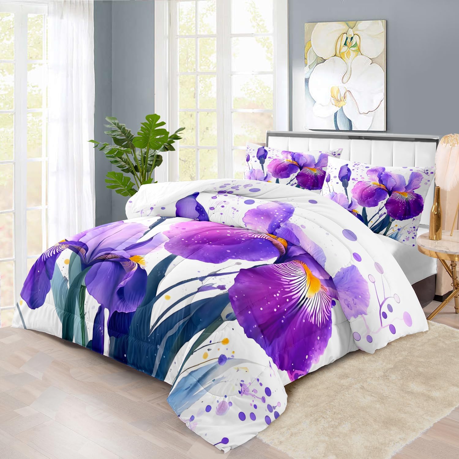- King Size Floral Iris Comforter Set :This bedding set includes 1 comforter(67" x 85") and 2 pillowcases(20”x30”). In order to facilitate transportation, the quilt is made of vacuum compression technology. It will be slightly wrinkled when taken apart, but it will quickly regain its fluffiness if you gently beat it.
