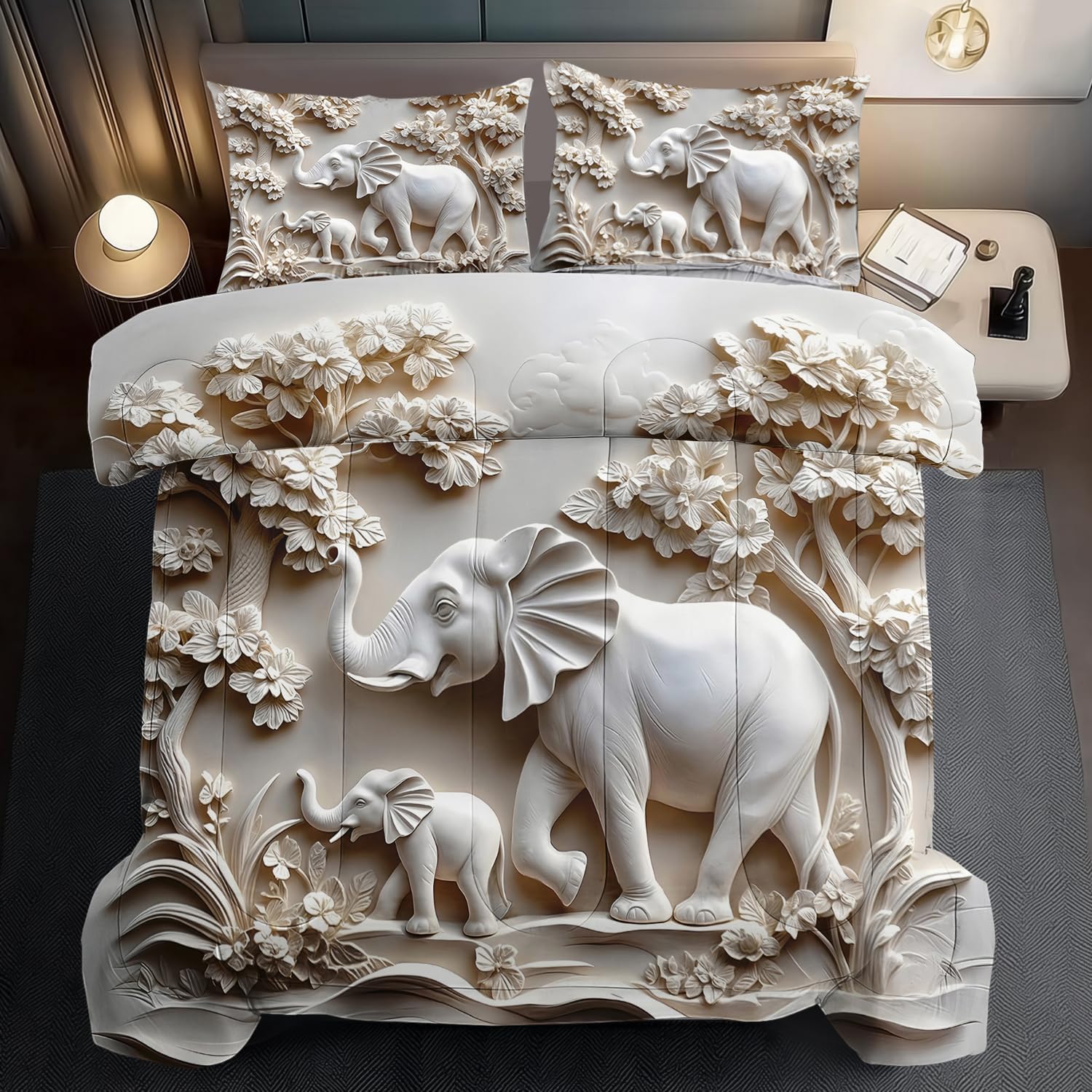 Elephant Comforter Set Twin Adult, White Animal Bedding Set Twin for Man, Cute Animal Comforter for Kids,Elephant Quilt Pattern White Bedroom Decor Womens, Relief Bedding
