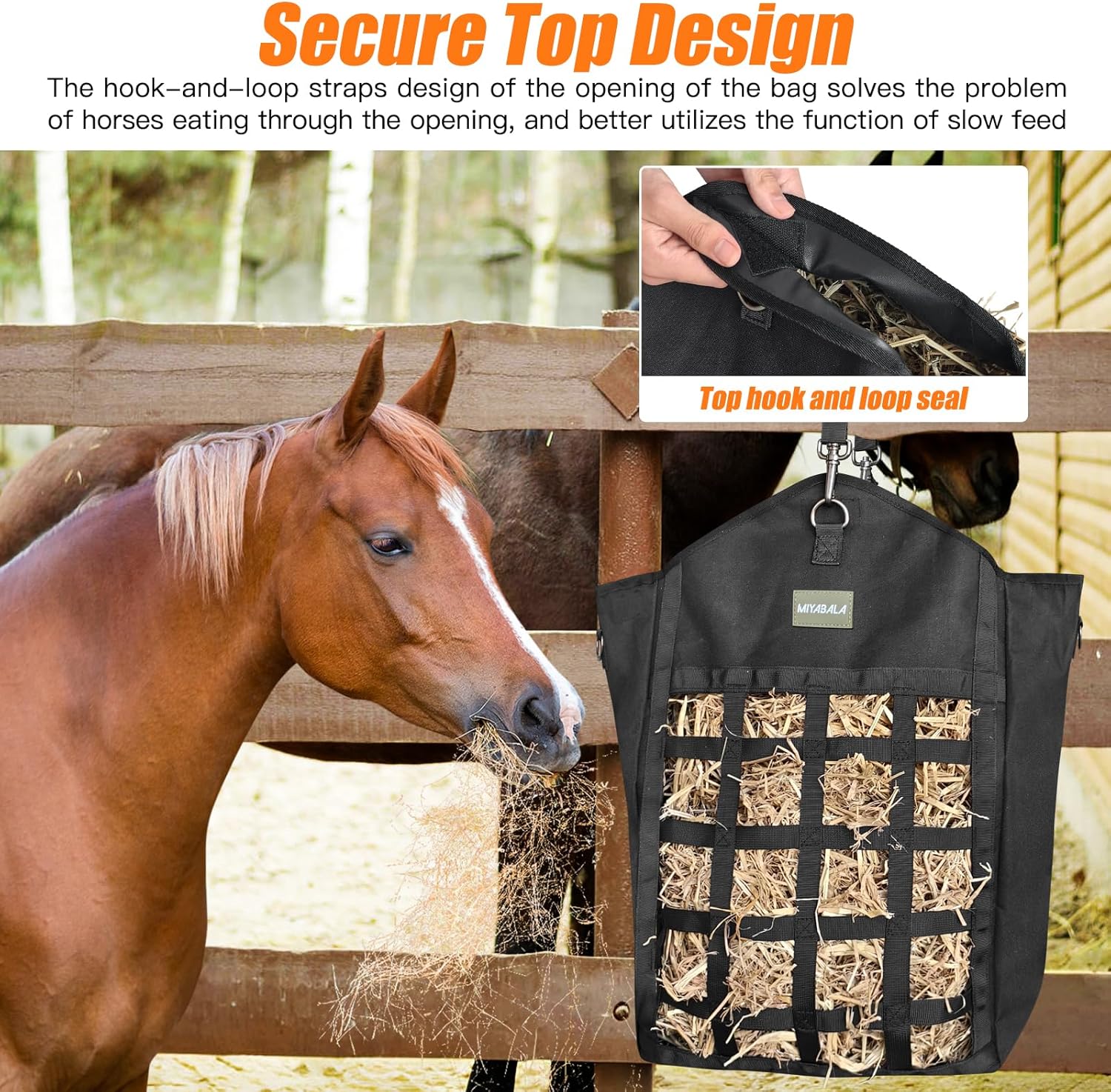 Hay Bags for Horses,Two-Sided Premium Oxford Slow Feed Hay Bags for Goats,Sheep,Donkey,Large Top Opening with Hook-and-Loop Seals,Easy to Hang with Adjustable Strap (Black, Large 1 Pack)