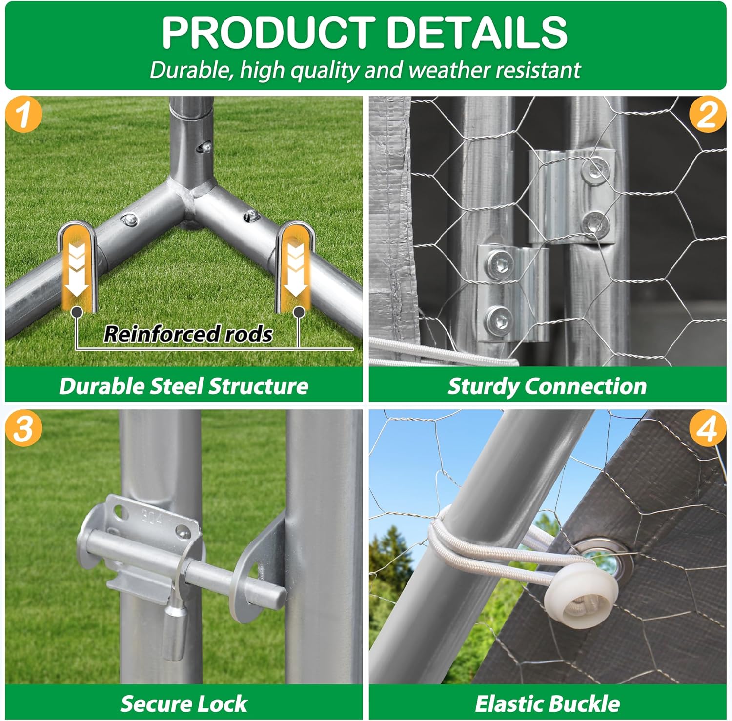 - 🐤STURDY& DURABLE: Our chicken coop is made of upgraded reinforced galvanized steel pipes with a thickness of 0.9 mm, which are strong, more durable and long-lasting than others(0.7 mm thick) . Secure hexagonal wire mesh ensures your chickens won't escape, creating a safe and comfortable outdoor space for your poultry
