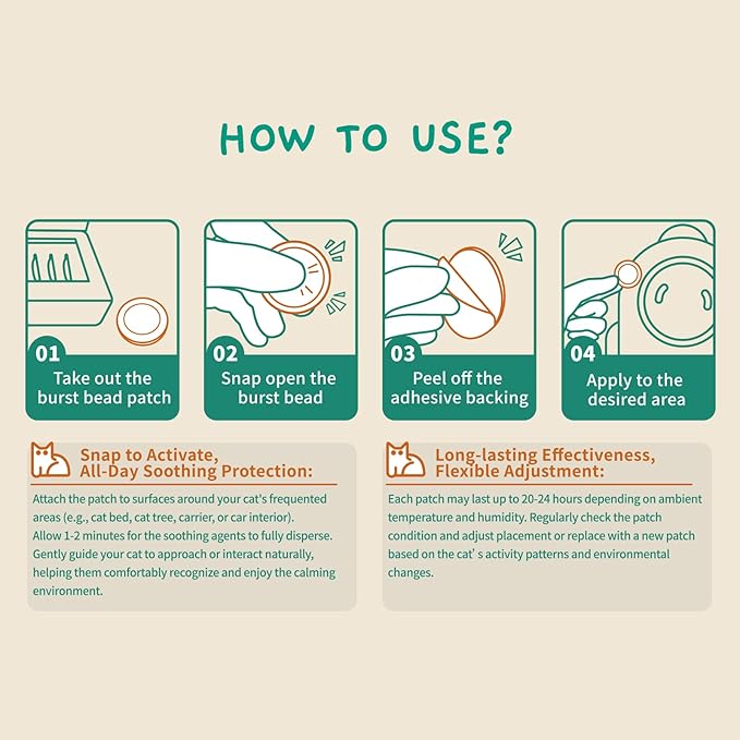 - Stick Anywhere, No Plug or Heat Required – Unlike traditional plug-in cat calming diffusers, this calming pheromone patch works instantly after activation. Simply press to release, then stick it to carriers, cars, crates, walls, or furniture. No outlet, no refills, no mess.