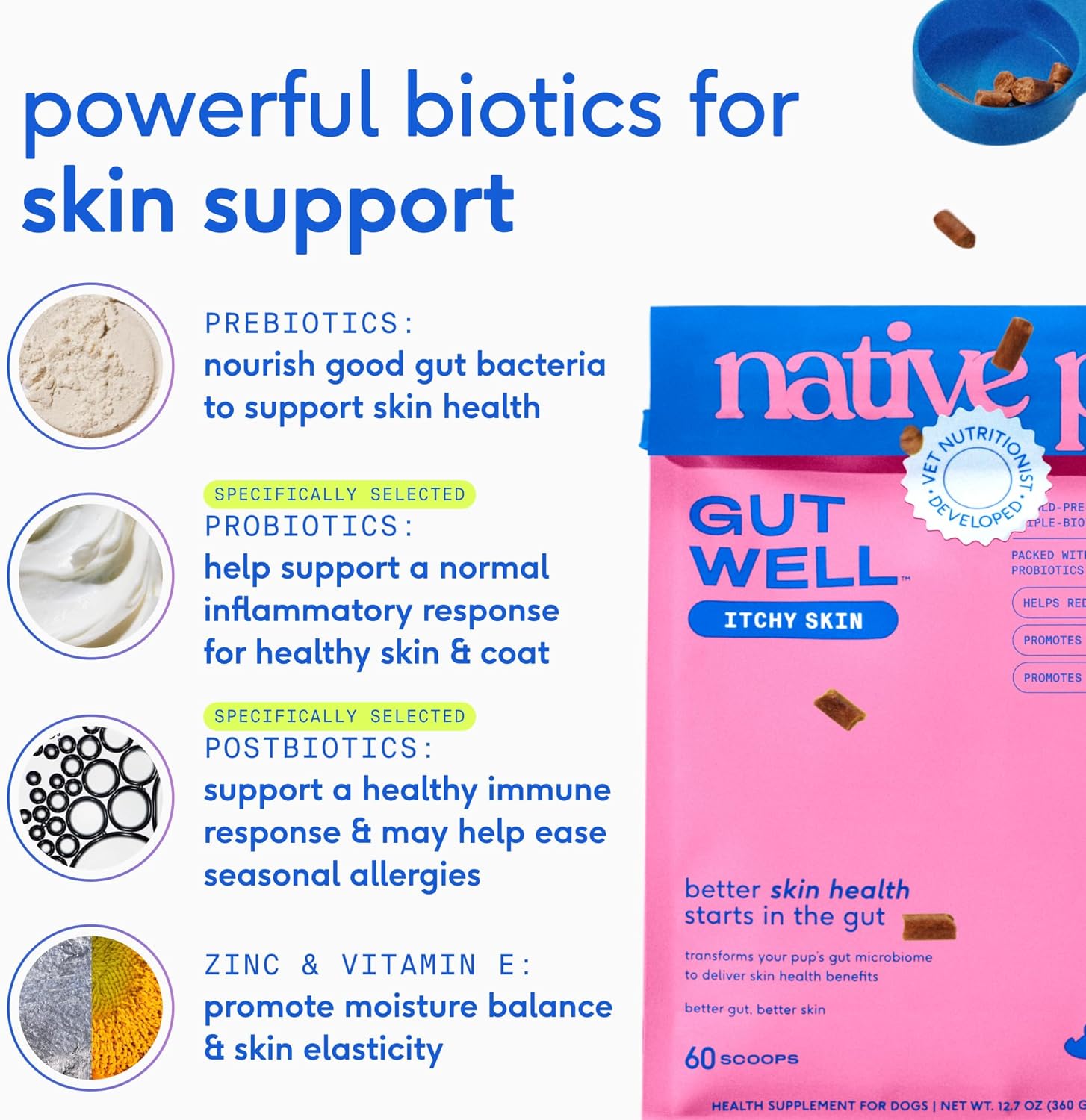 GutWell Itchy Skin - Dog Itching Skin Relief & Seasonal Allergy Itch Relief for Dogs - Promotes Skin Hydration, Elasticity & Healthy Barrier with Triple-biotic Blend, Zinc, & Vitamin E - 60 Scoops