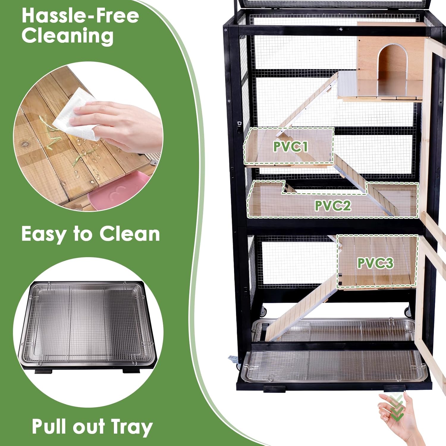 - Hassle-Free Cleaning:Slide-out stainless steel tray and large front doors make cleaning easy. Say goodbye to stubborn stains! The detachable PVC-coated surfaces wipe clean in seconds—ideal for large critter nation cage maintenance