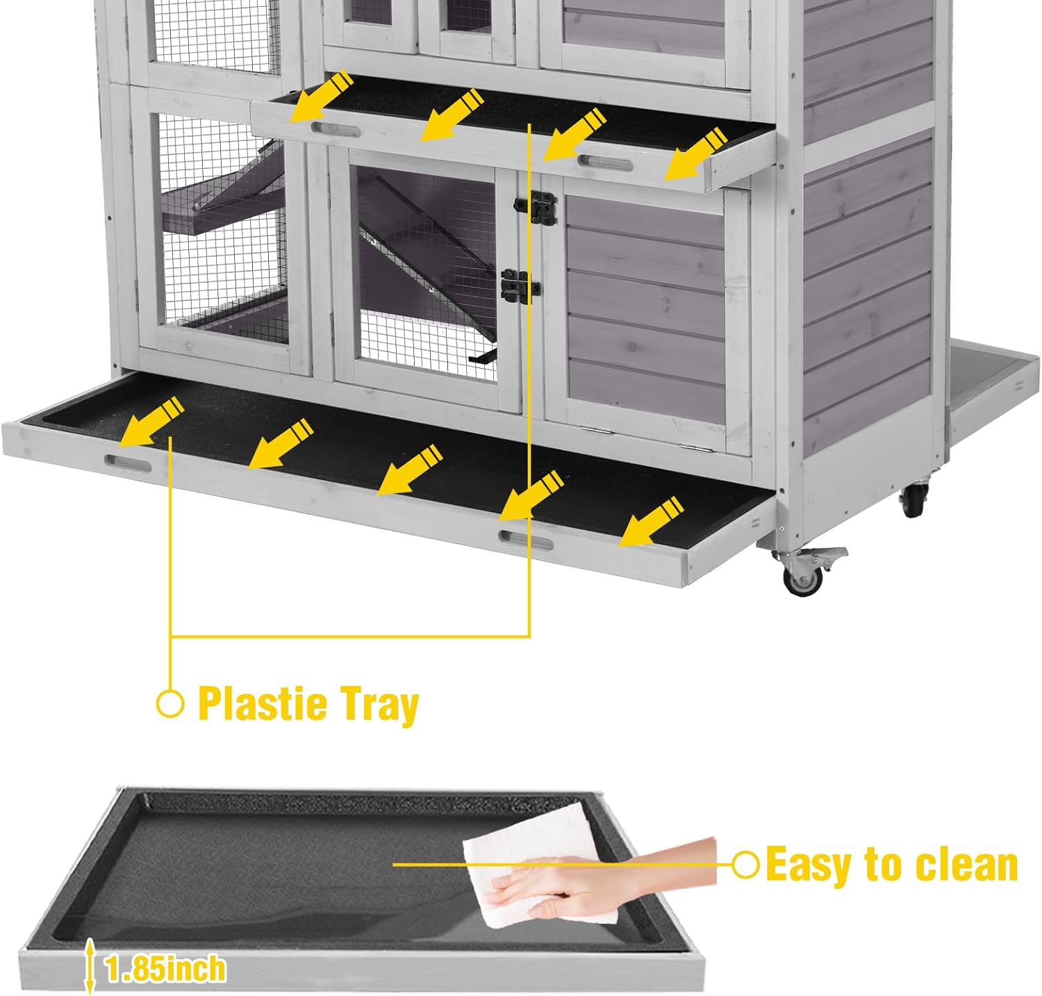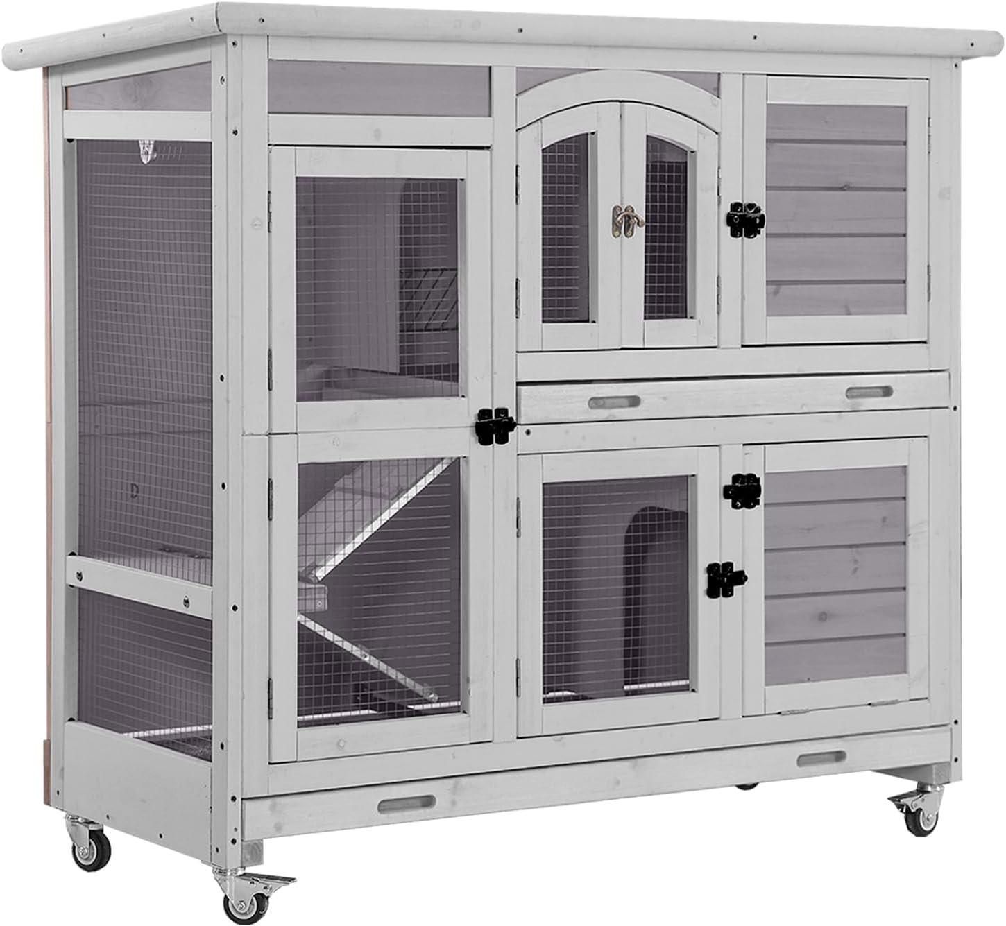Aivituvin Rabbit Hutch Indoor, Bunny Cage with Wheels, 2-Story Design, 2 Deep Trays, Anti Slip Ramp, Ideal for Small Animals - Grey