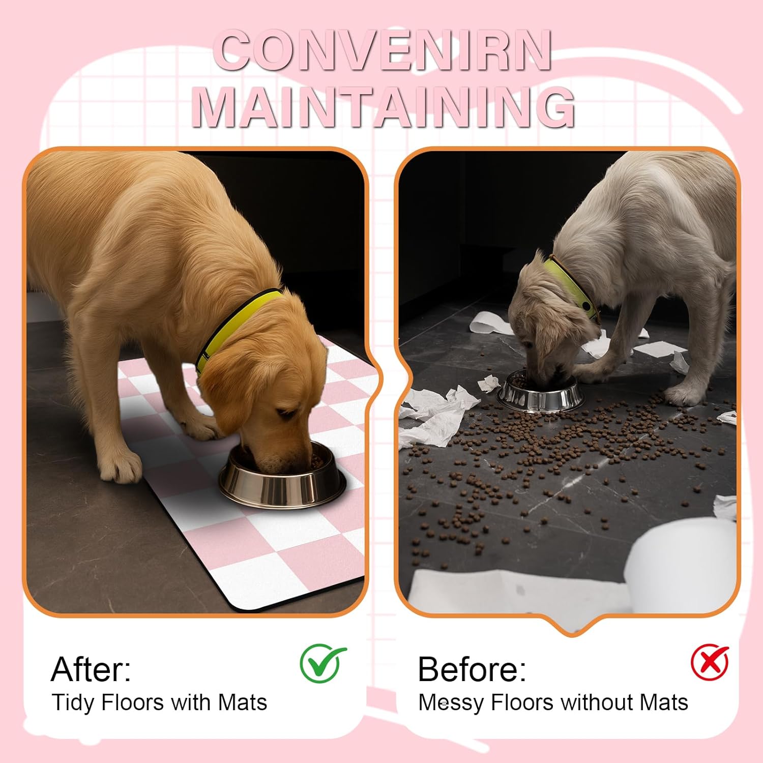 Pet Feeding Mat, 16"x 24" Absorbent Dog Food Mat, Checkered Cat Bowl Mats, Easy to Clean Pet Placemats, Quick Dry Dog Water Dispenser Mats for Messy Drinkers, Pink & White