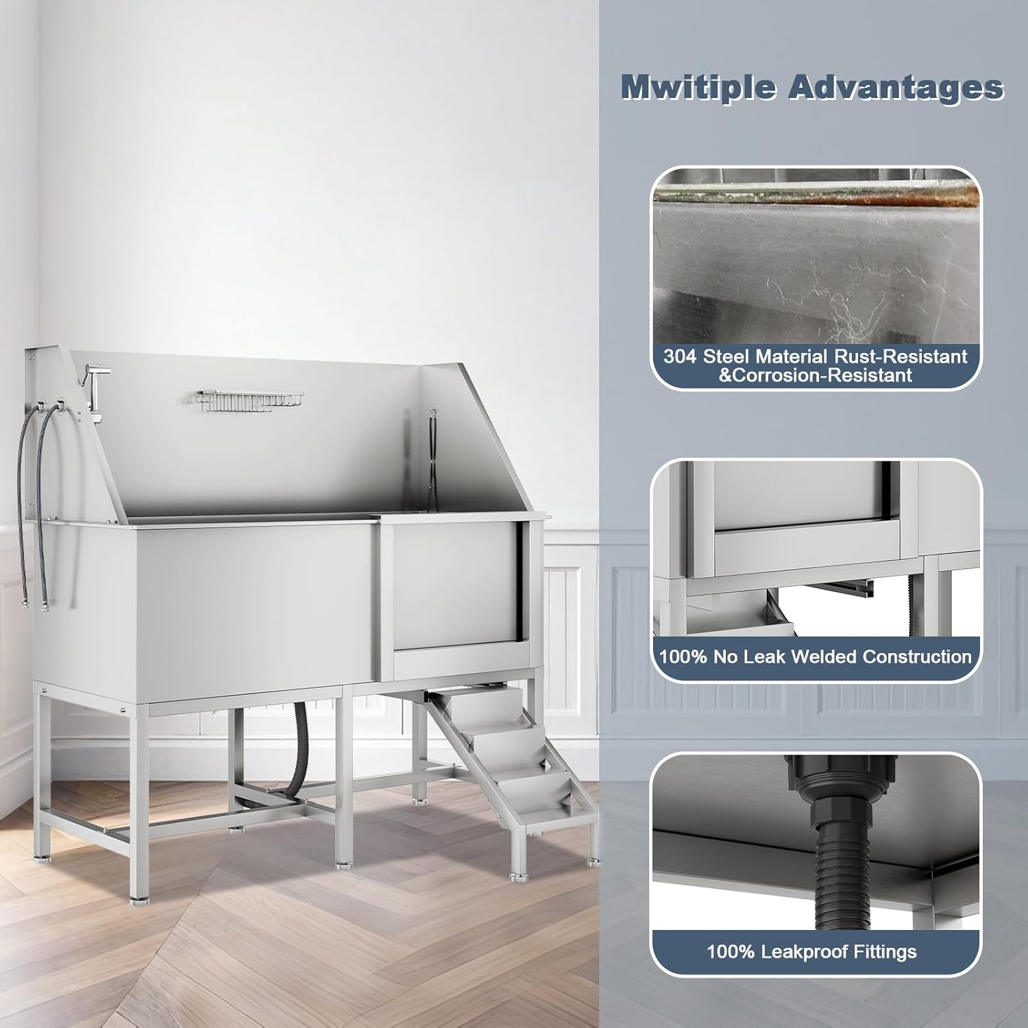 - 【Efficient Drainage and Leak-Free】:This dog wash station is equipped with a high-performance drainage system and integrated filter to prevent hair clogs. Our sewer hose connectors have screw-in threads and and the drain port is installed more securely. Stainless steel tub use seamless welding technology ensuring that the entire wash sink is leak-free and long-lasting use.