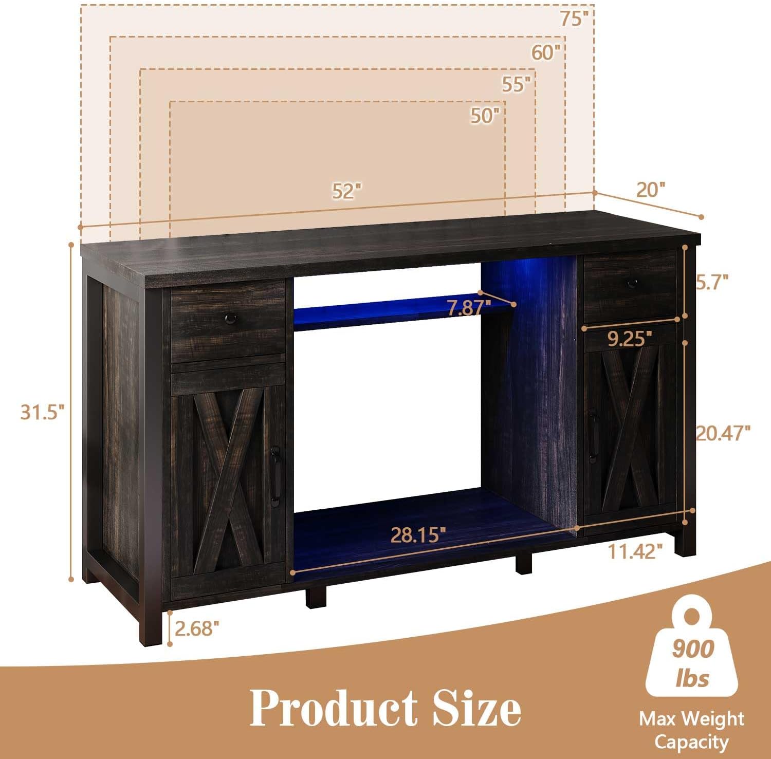 75 Gallon Fish Tank Stand with LED Light & Power Outlets, 55-75 Gallon Heavy Duty Metal Aquarium Stand with Drawers & Barn Doors, Cabinet for 2 Fish Tank Accessories Storage, Dark Oak