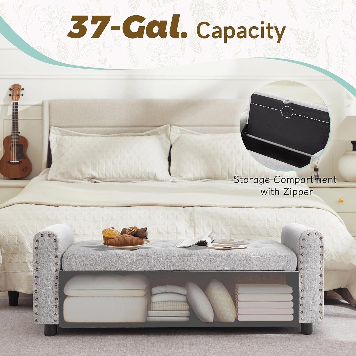 Ottoman with Storage, Tufted Storage Bench for Bedroom, 48" Fabrics End of Bed Bench, Upholstered Entryway Shoe Benches with Rolled Arm & Inner Zipper, Window Ottomans Chest with Rivets, Light Grey