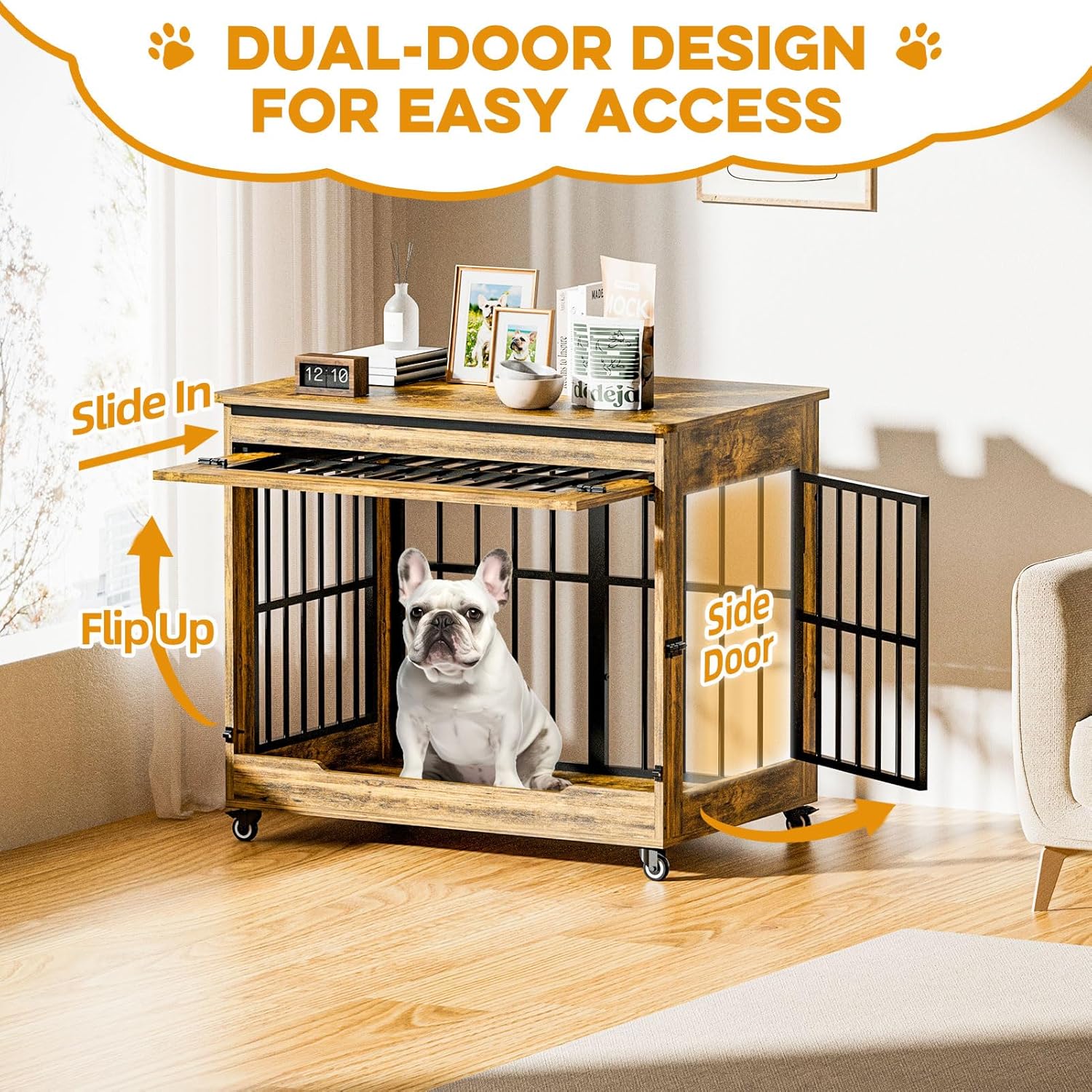 38" Dog Crate Furniture, Double Door Wooden Indoor Dog Kennel Furniture, Decorative Pet Cage End Table with Wheels for Large and Medium Breed Dogs, Size L, Rustic Brown