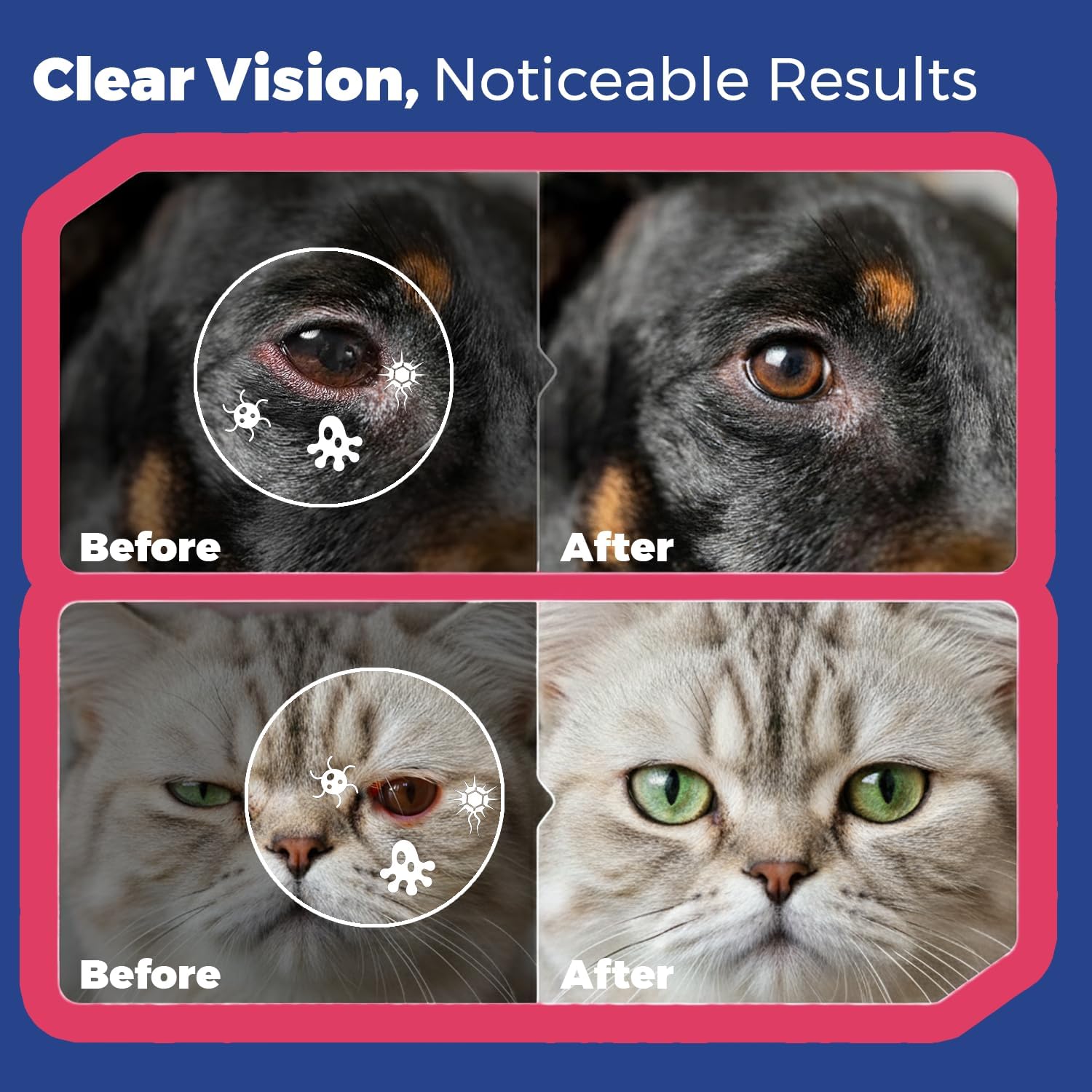 - Daily Cleaning - This eye drop for dogs and cats is suitable for daily eye care of pets, removes tear stains and smudges, restores the shine of the hair around the eyes and soothes canine, feline, and dog eye infection treatments, itchy foreign body discharge and other symptoms