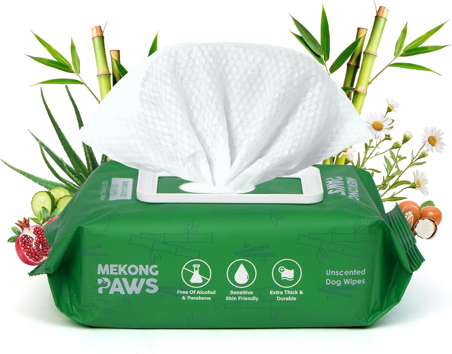 Unscented Pet Grooming Wipes - Natural Bamboo Fiber - Cleansing Wipes for Dog & Cat - Soft & Caring for Sensitive Skin - Durable & Tear Resistant for Paw, Coat & Bum Freshening - 100 Count